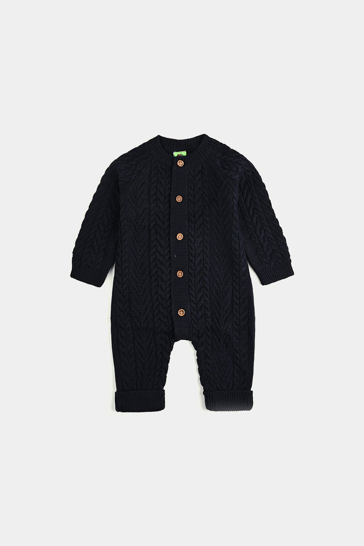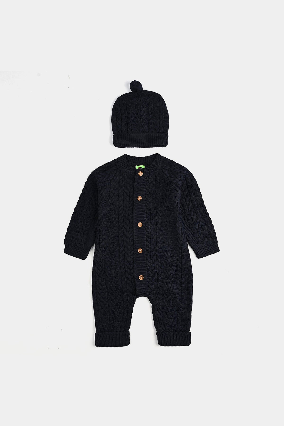 Keep him snug in style! A full-coverage romper featuring ribbed sleeves, a crew neck, and a matching cap, perfect for a complete winter-ready look.