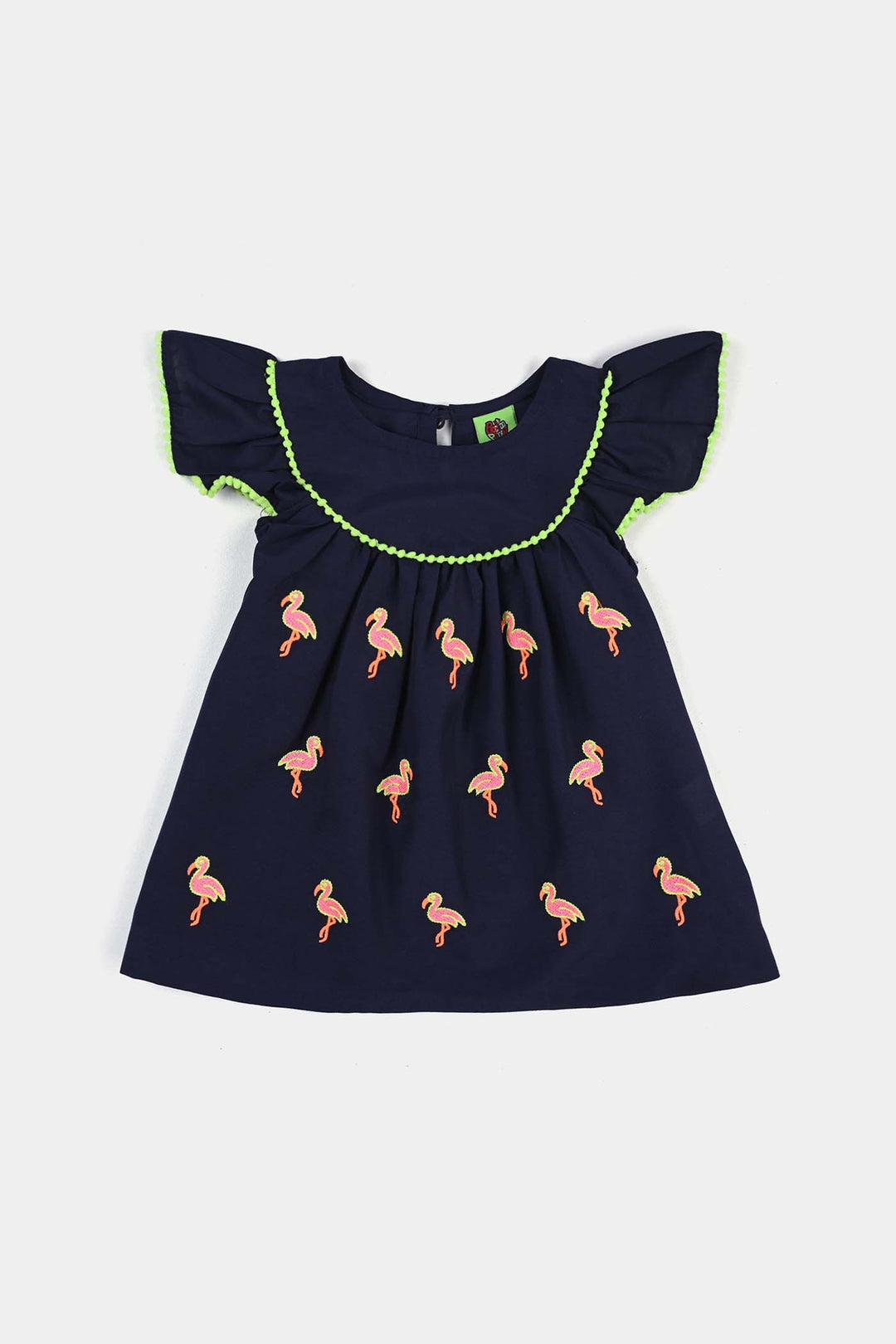Infant Girls Poly Cambric Emb kurti Little Flamingos-Navy Blue