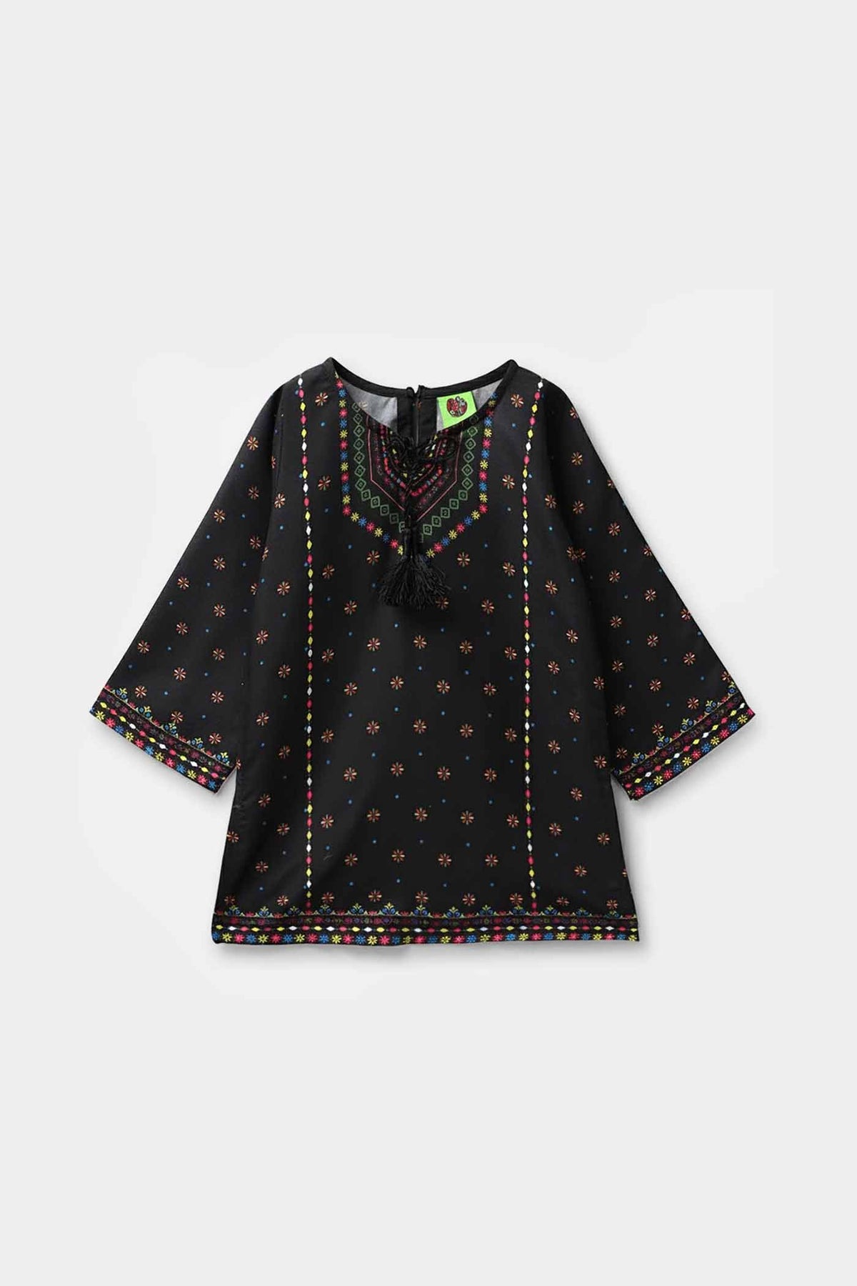 This girls poly cambric printed shirt features full sleeves and a dori-tied neckline and can be paired with tights or any bottom for a complete stylish look.