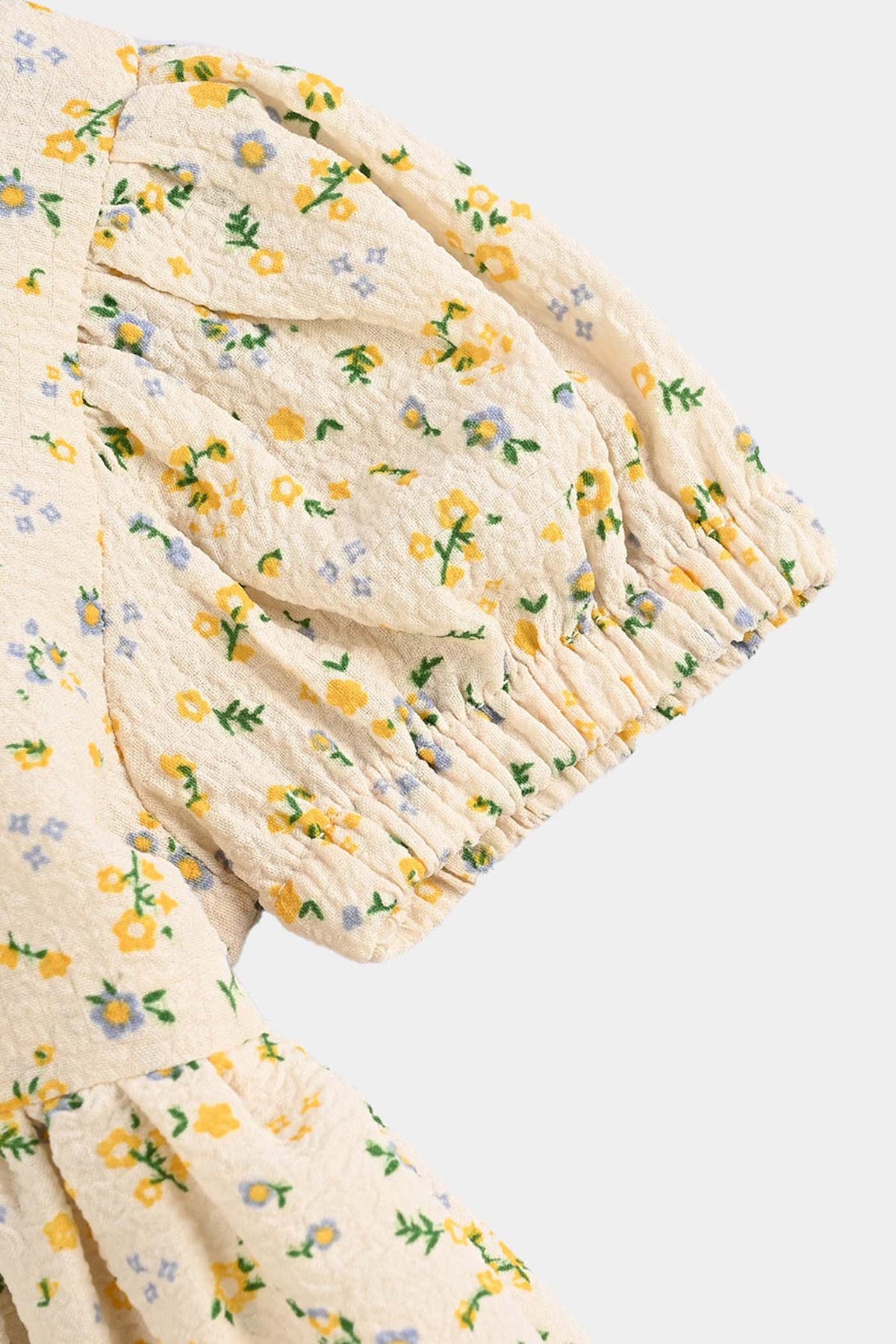 This cute white dress has a yellow and green floral print. Features sweet short puff sleeves and a peplum silhouette. Perfect for those sunny days filled with play.