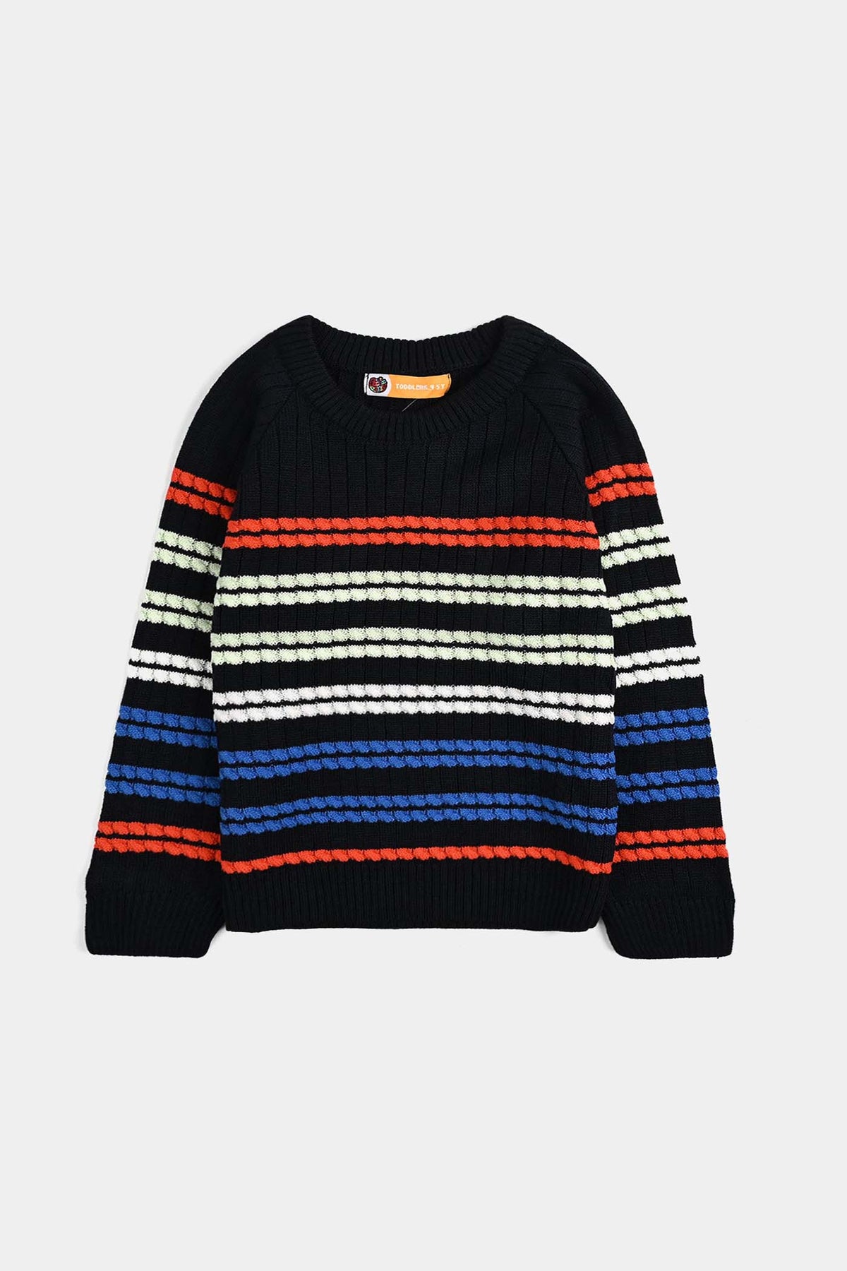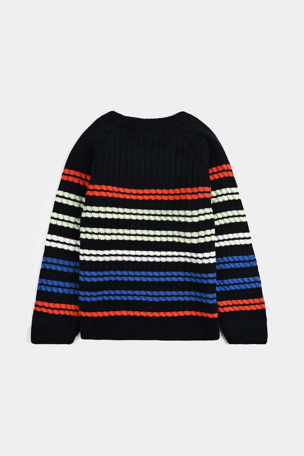 This cozy sweater features a classic black canvas contrasted by bold, vibrant stripes that add a pop of color and personality. Ideal for layering during chilly days or wearing solo for a standout look, it keeps him warm while ensuring he stays effortlessly cool.