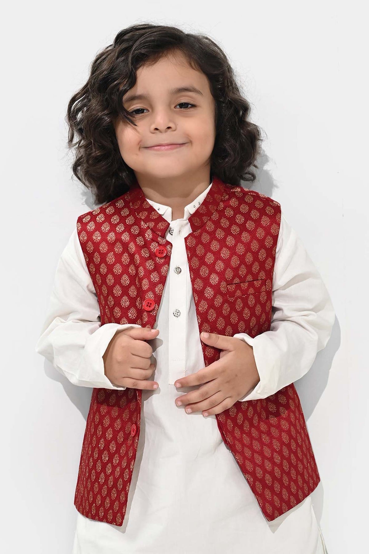 Bachaa Party brings you the best price Boys Poly Viscose Waist Coat (Golden Lurex)-RED with express shipping all over Globe.