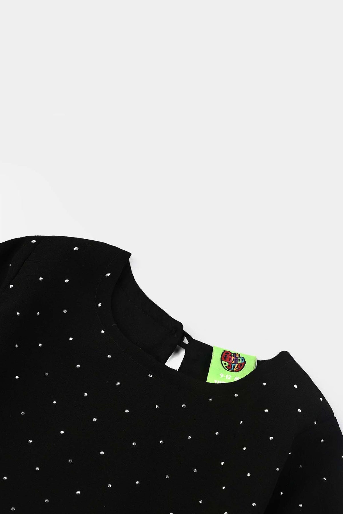 This black georgette top features playful loop-tie details on the sleeves, making it a perfect blend of casual charm and modern style.