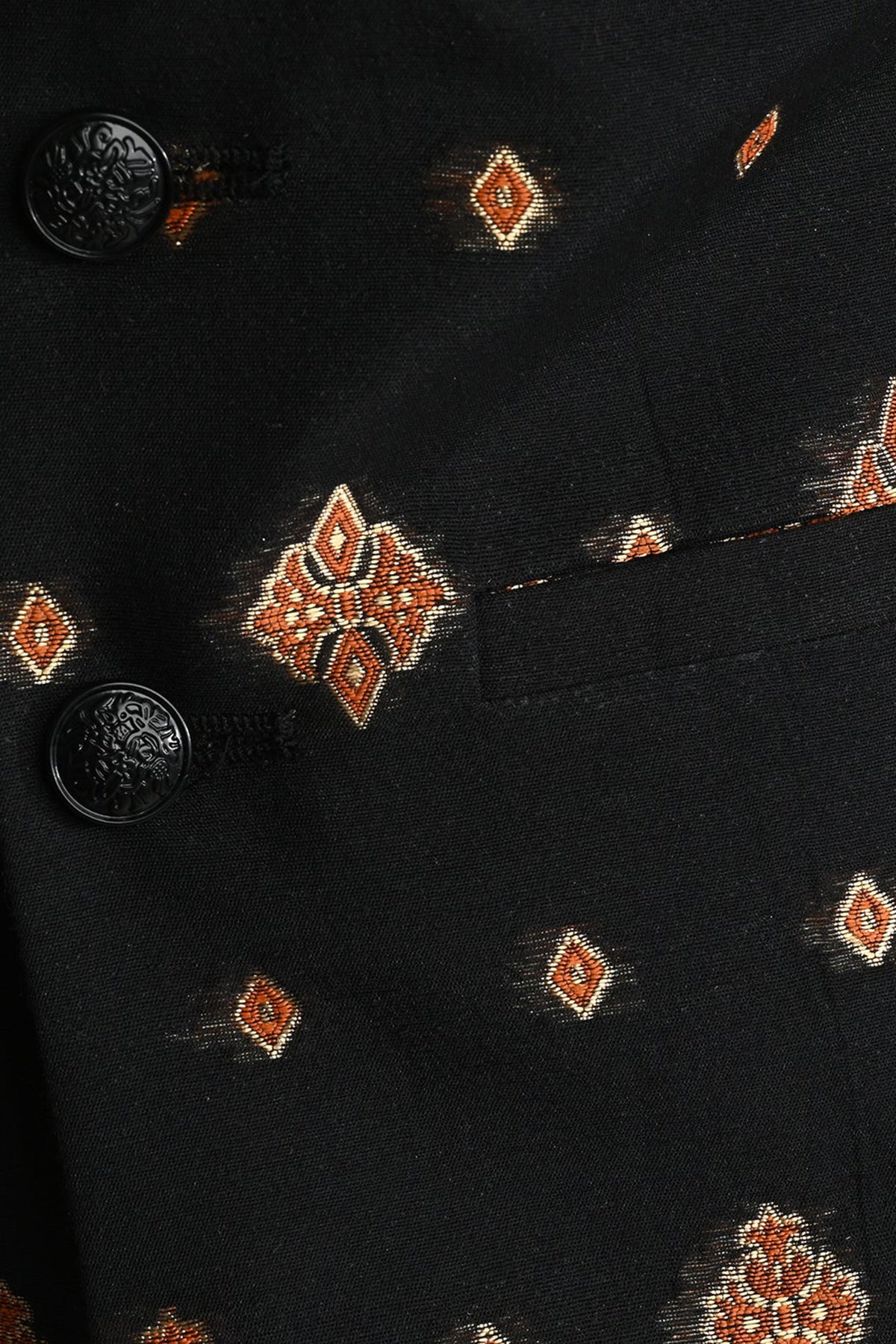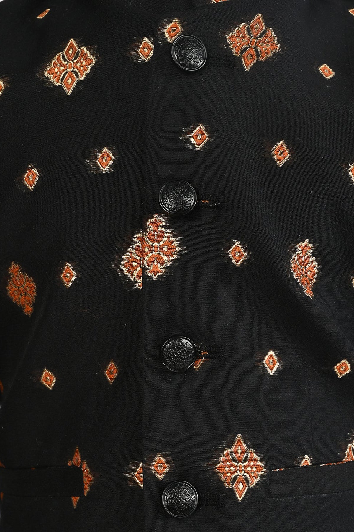 Make a statement with this three-piece classy black outfit. The ban collar kurta with full-length sleeves is paired with straight pajamas. Completing the look is a waistcoat for a refined look.
