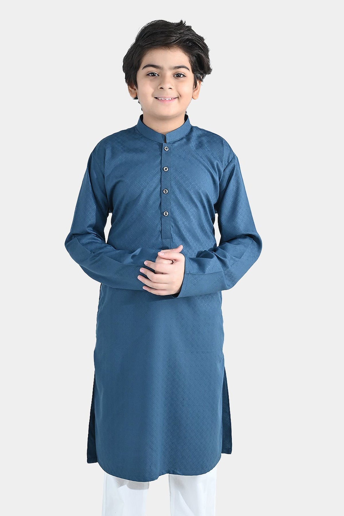 Boys’ poly viscose jacquard kurta in teal green, featuring a shirwani collar for a classic and elegant look. Perfect for festive or casual occasions.