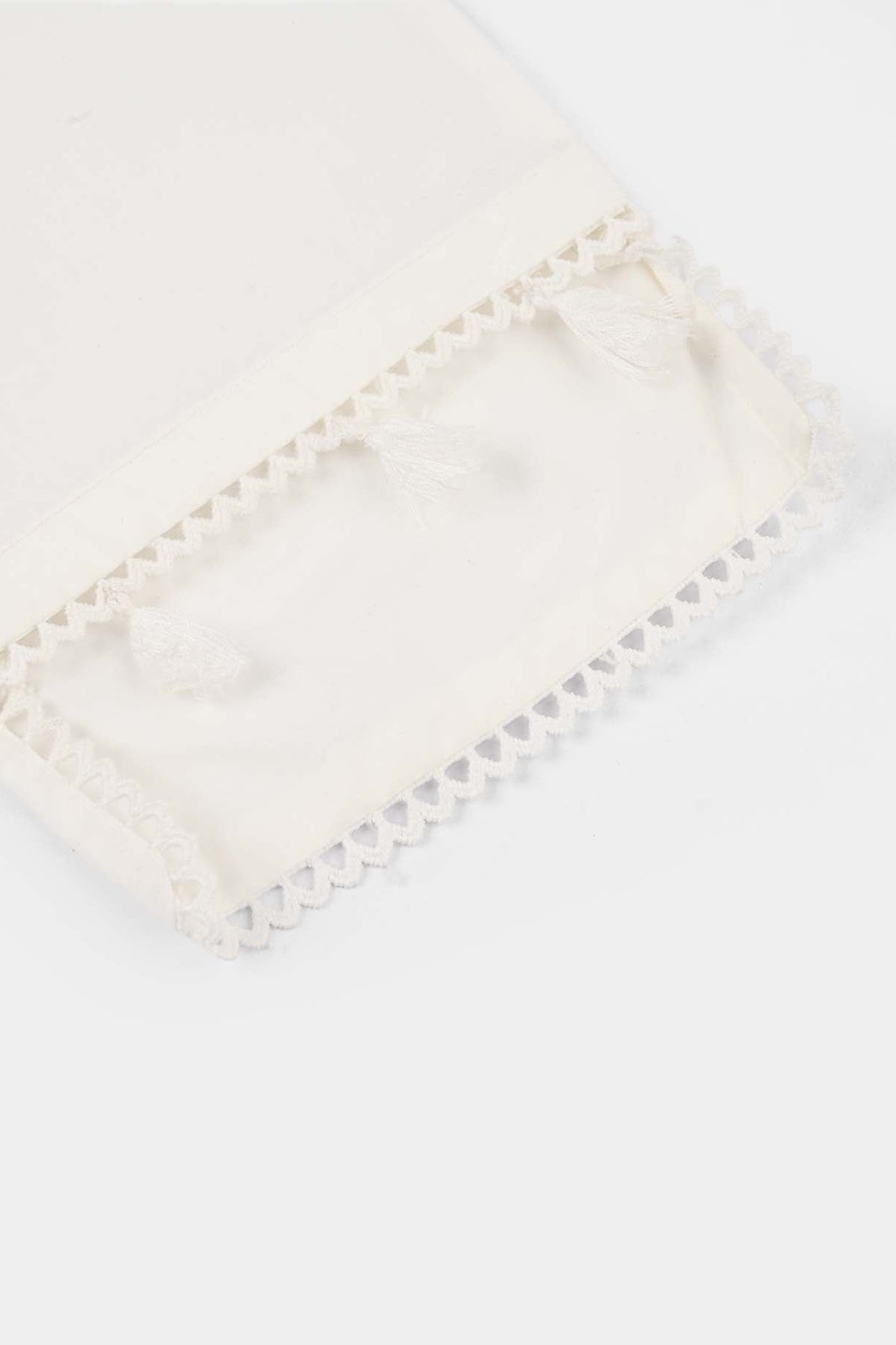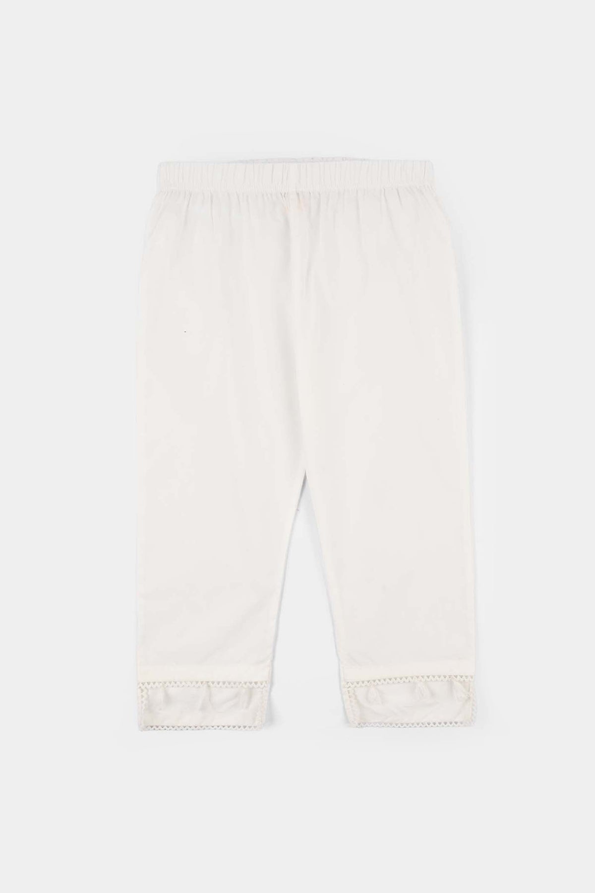 These white cotton pants for girls feature a straight fit with hem lace detailing and hanging tassels, perfect for casual or festive wear.