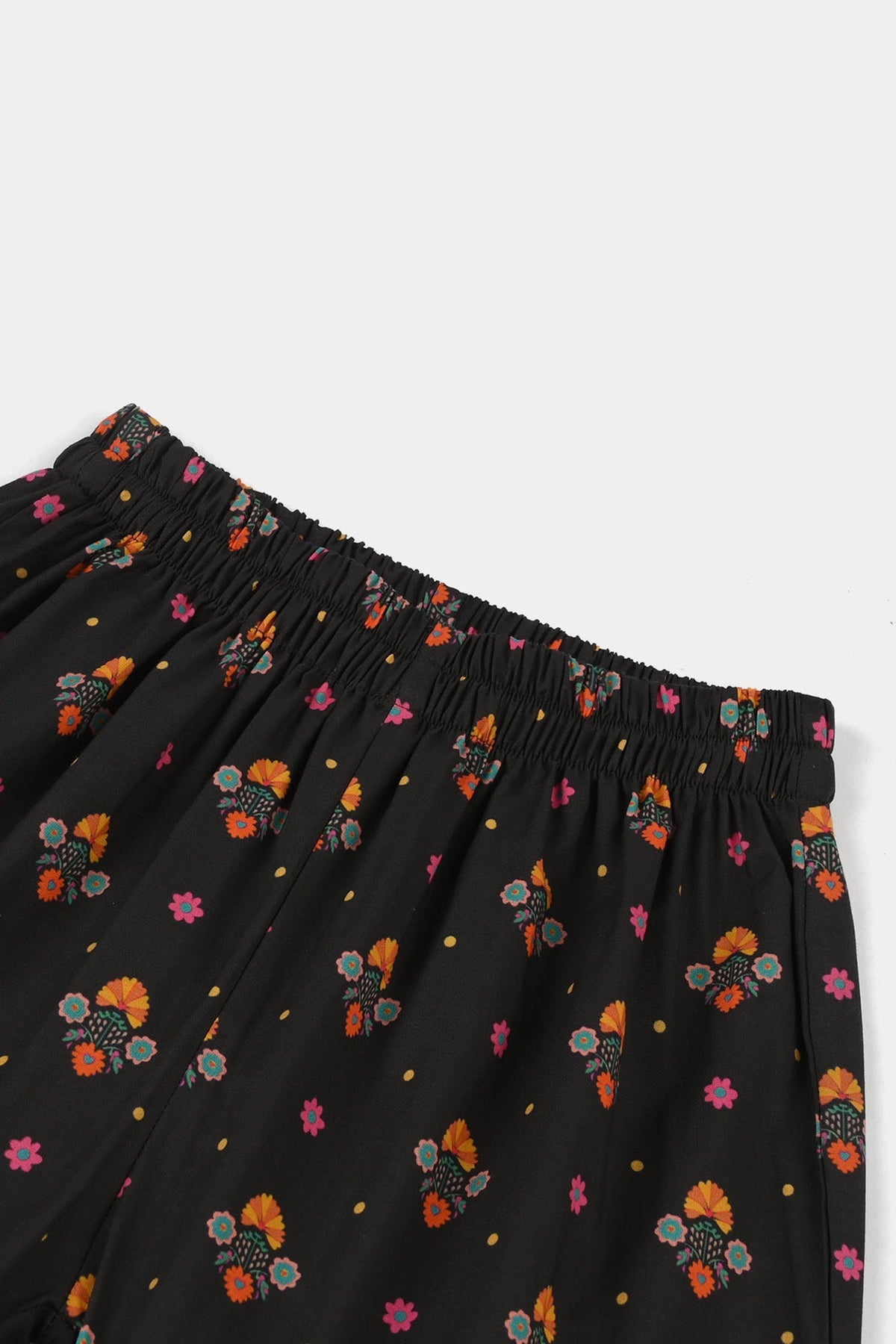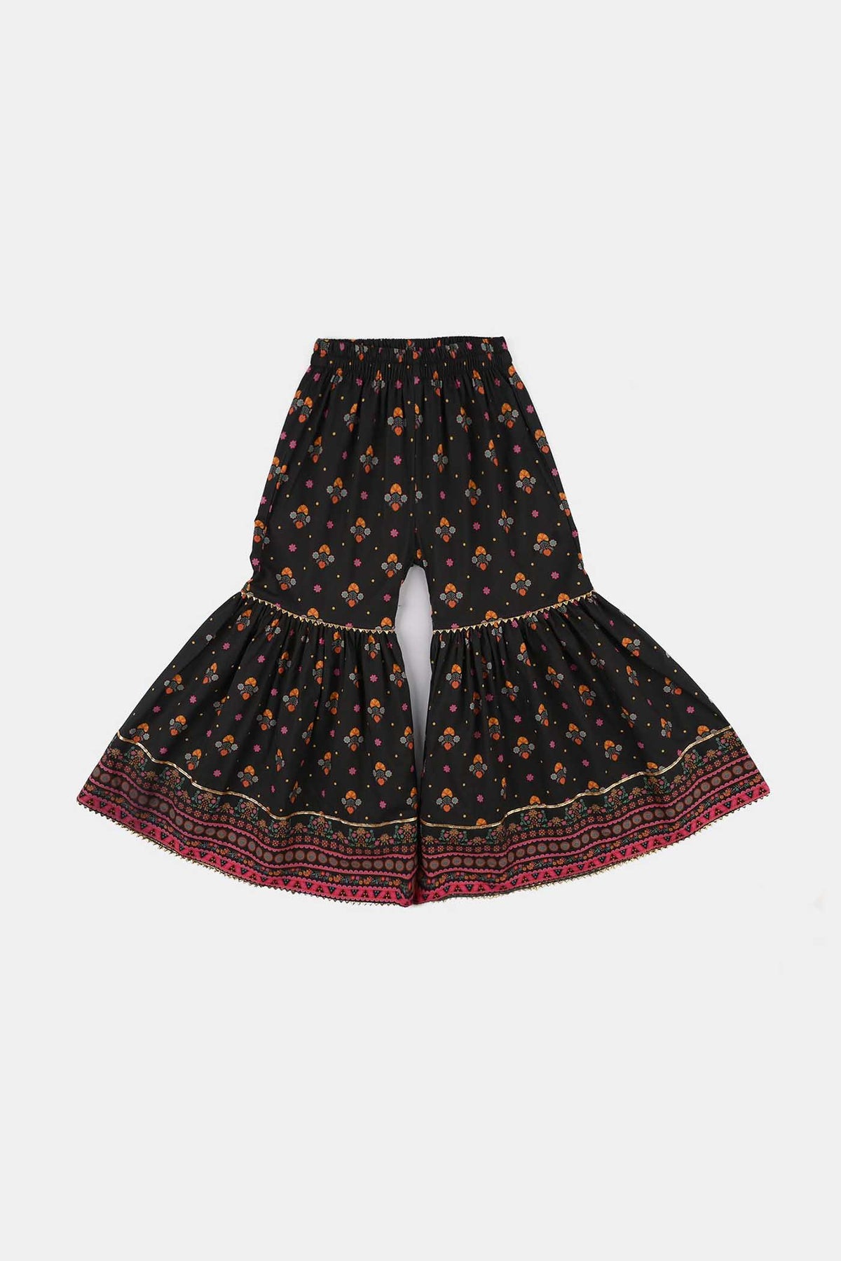 This black cotton printed gharara for girls features a comfortable fit with stylish prints, perfect for casual wear or festive occasions.