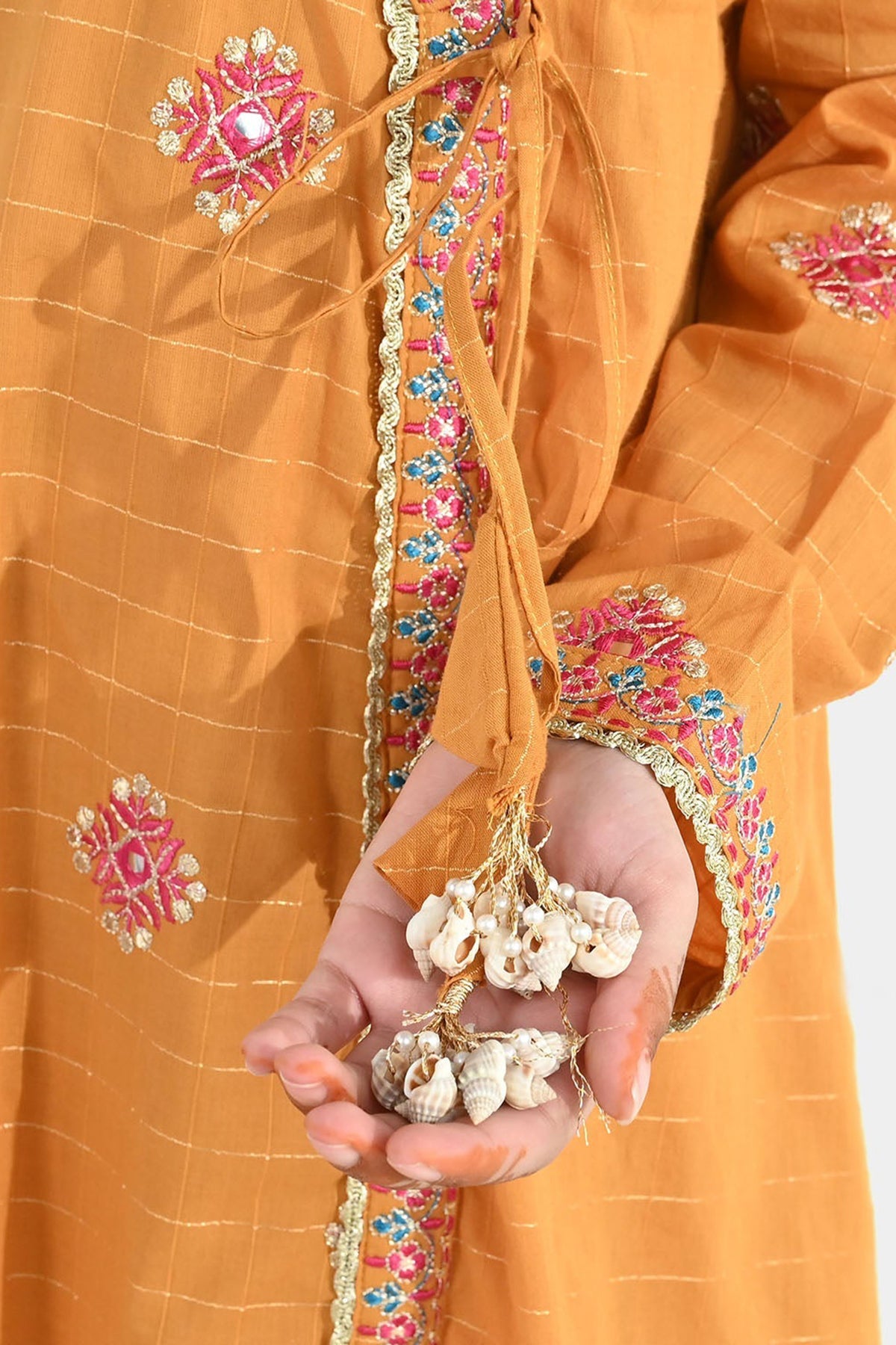 Girls’ dobby 3-piece set in mustard, featuring an anarkha-style embroidered shirt with dori detailing, full sleeves, matching bottoms, and a contrast pink dupatta. Perfect for festive and traditional occasions.