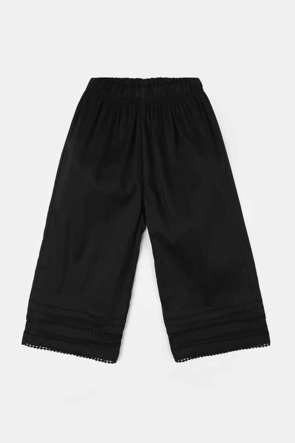 These black cotton culottes for infant girls feature lace detailing, perfect for a stylish and comfortable everyday look.