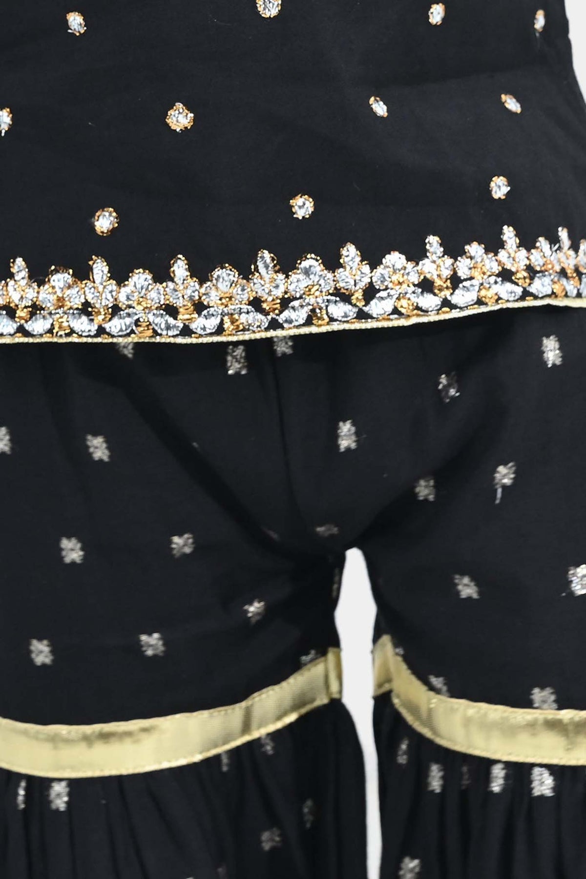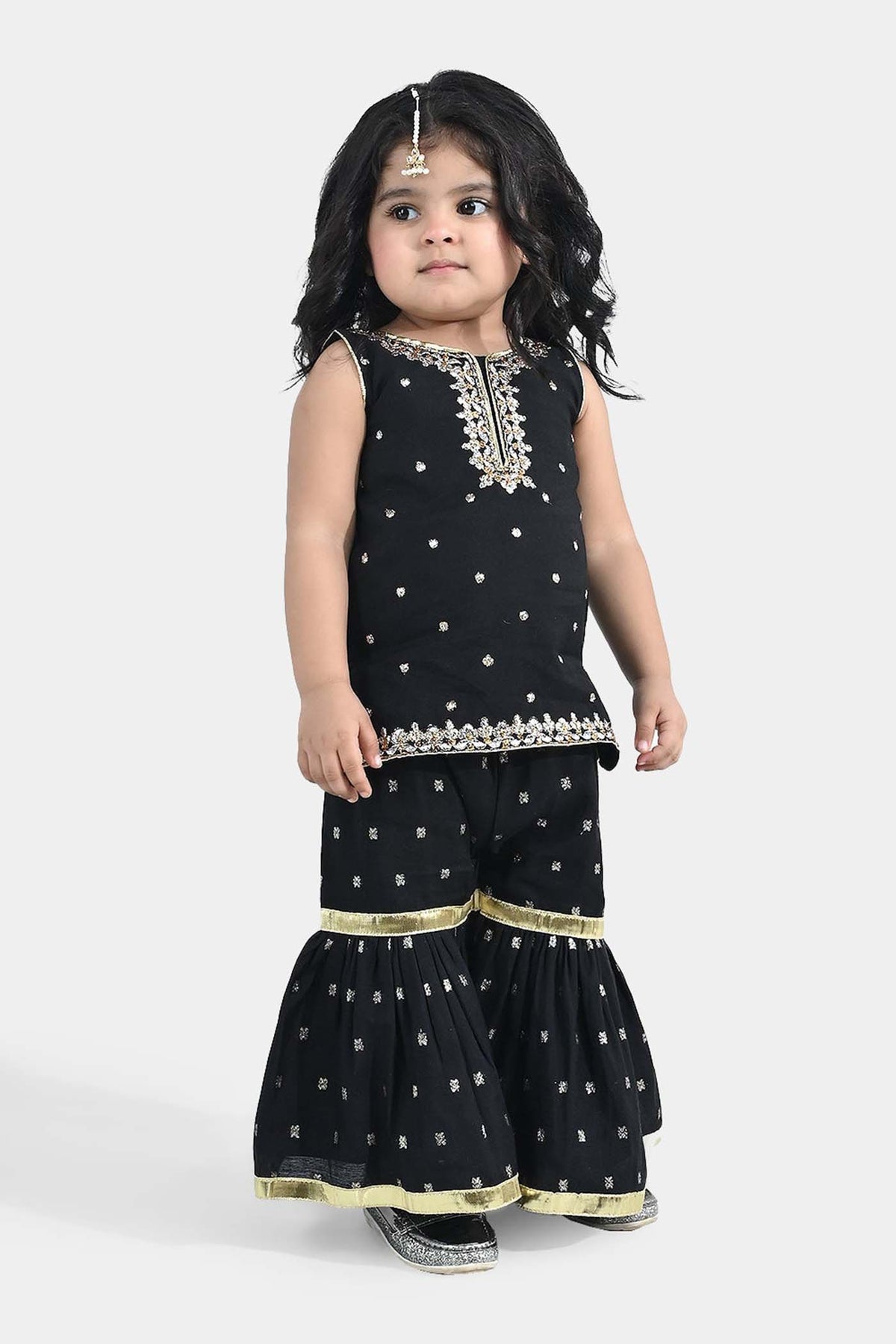 Infant girls’ jacquard 2-piece set in Black featuring neckline embroidery, a sleeveless shirt with border detailing, and matching gharara with lace embellishment. Perfect for a stylish and festive look.