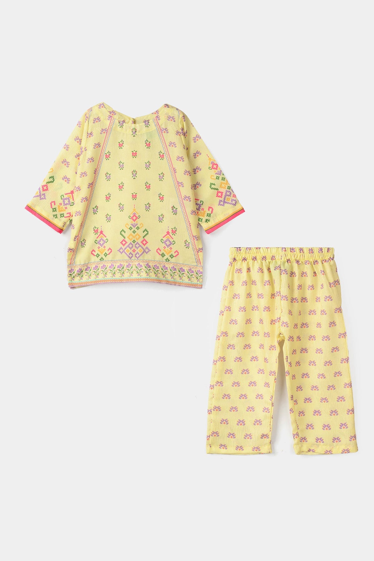 Infant girls’ jacquard printed 2-piece set in yellow featuring a boat neck, full sleeves, and a straight fit with matching loose bottoms. Stylish yet comfortable for everyday wear.