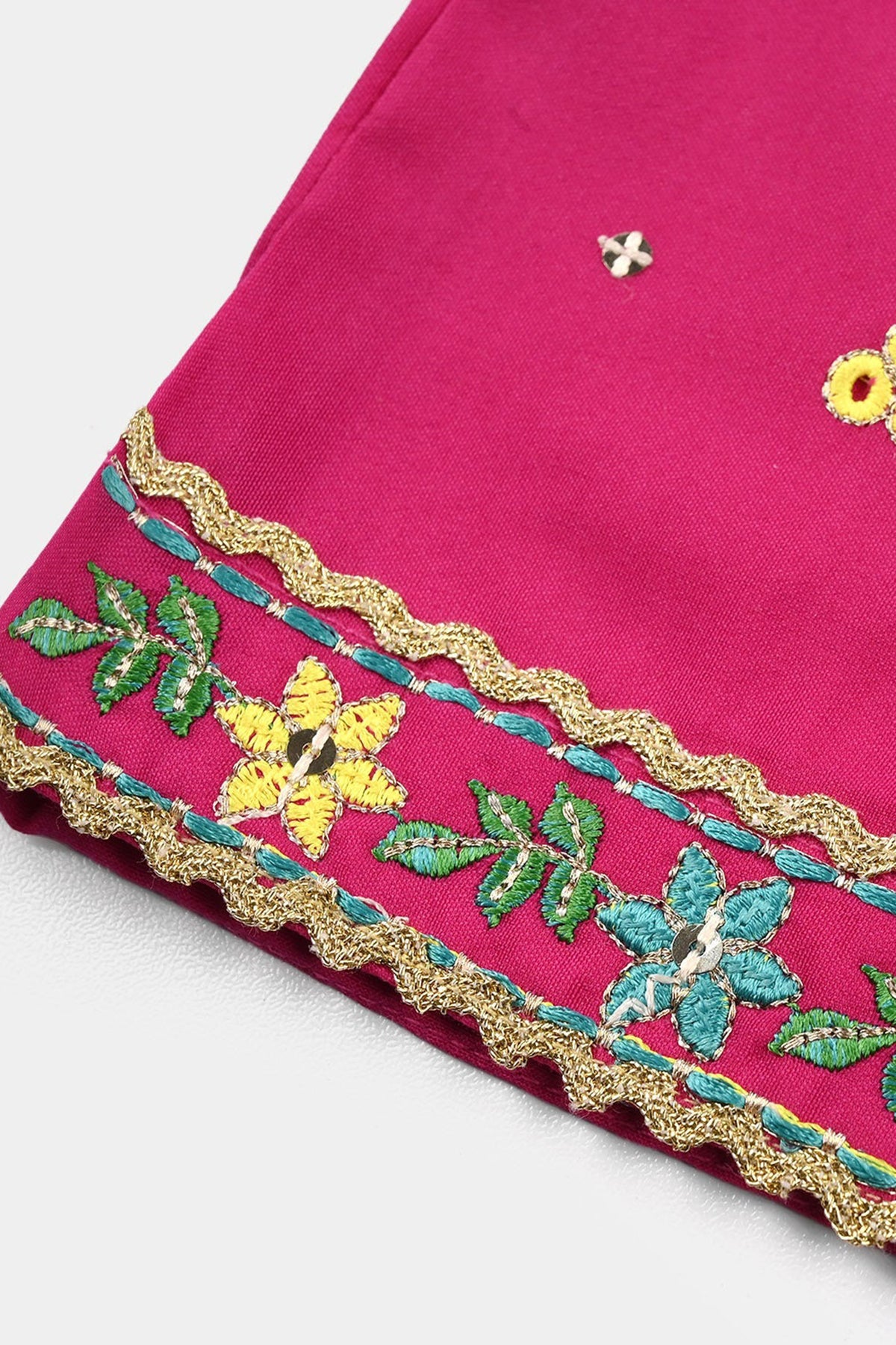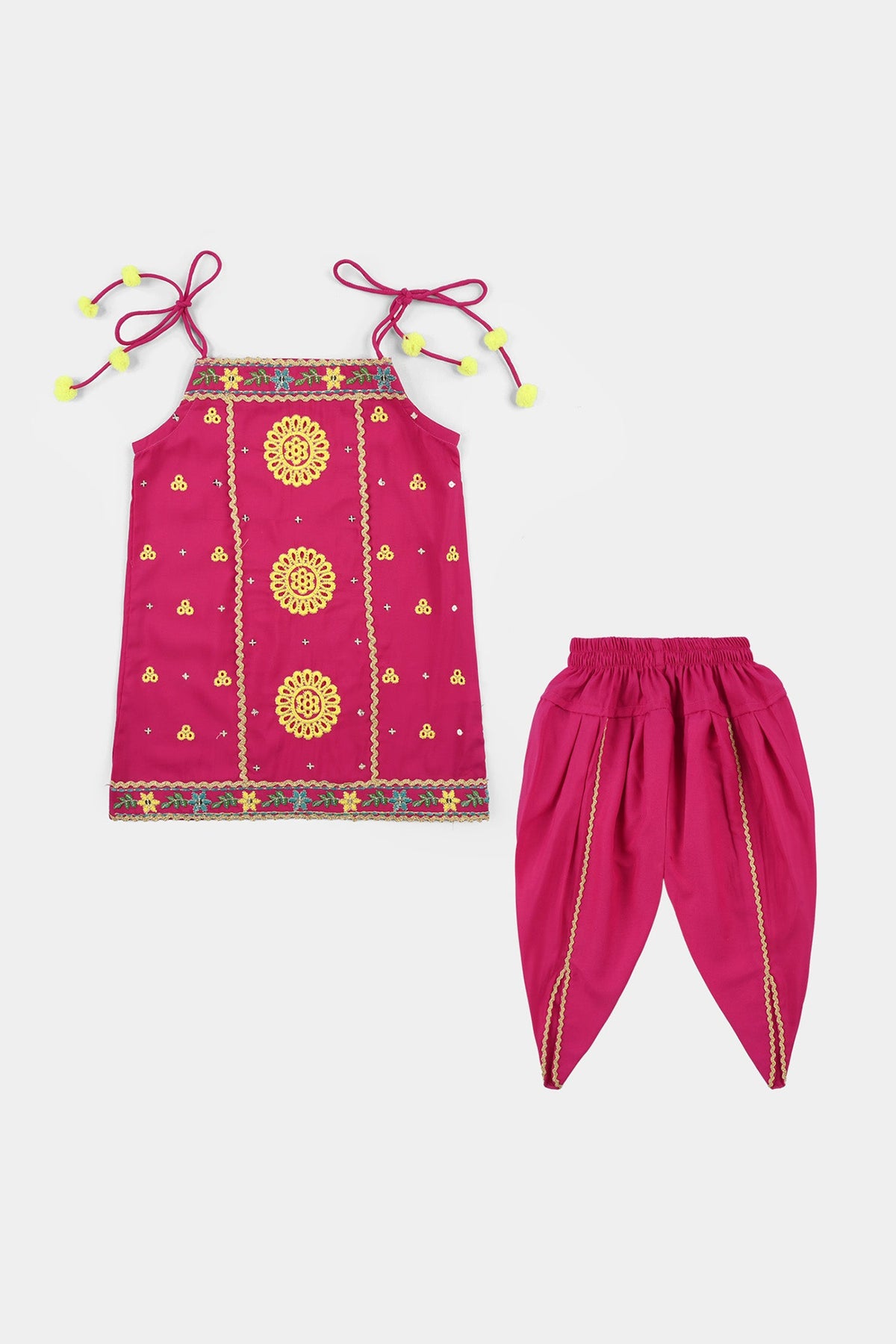 Infant girls’ raw silk 2-piece set (Mah-E-Rang) in shocking pink featuring a sleeveless shirt with knot detailing, a printed shirt, and matching bottoms with lace embellishment.