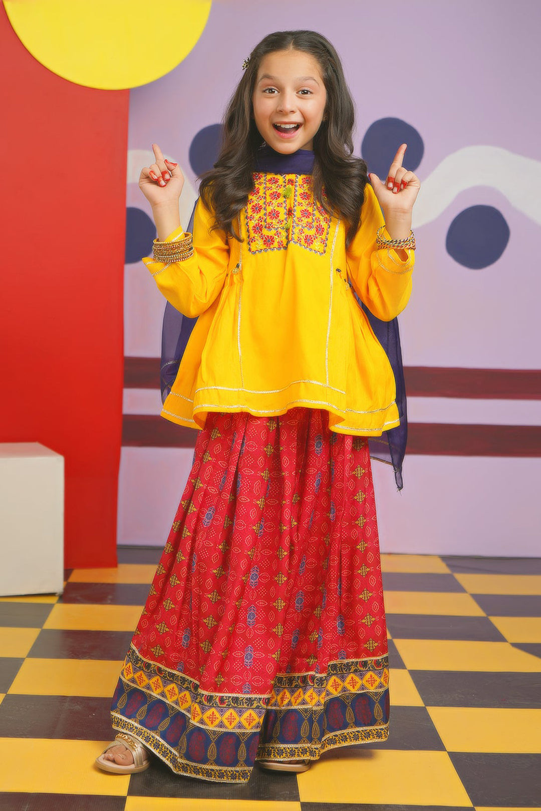 Girls Raw Silk 3PCs Suit Chunri-Yellow