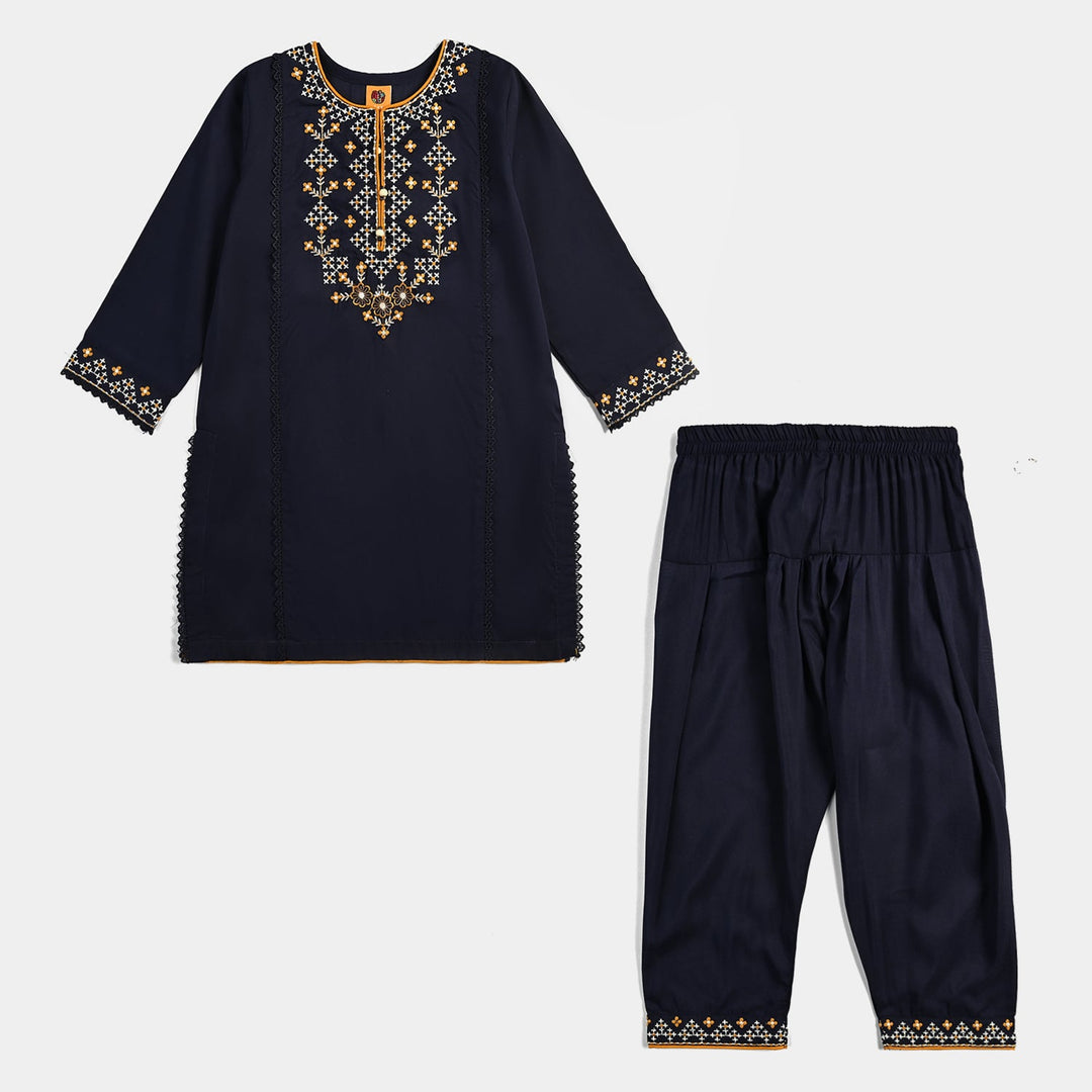 Girls poly cambric Emb 2Pcs Suit Tarz-Navy Blue