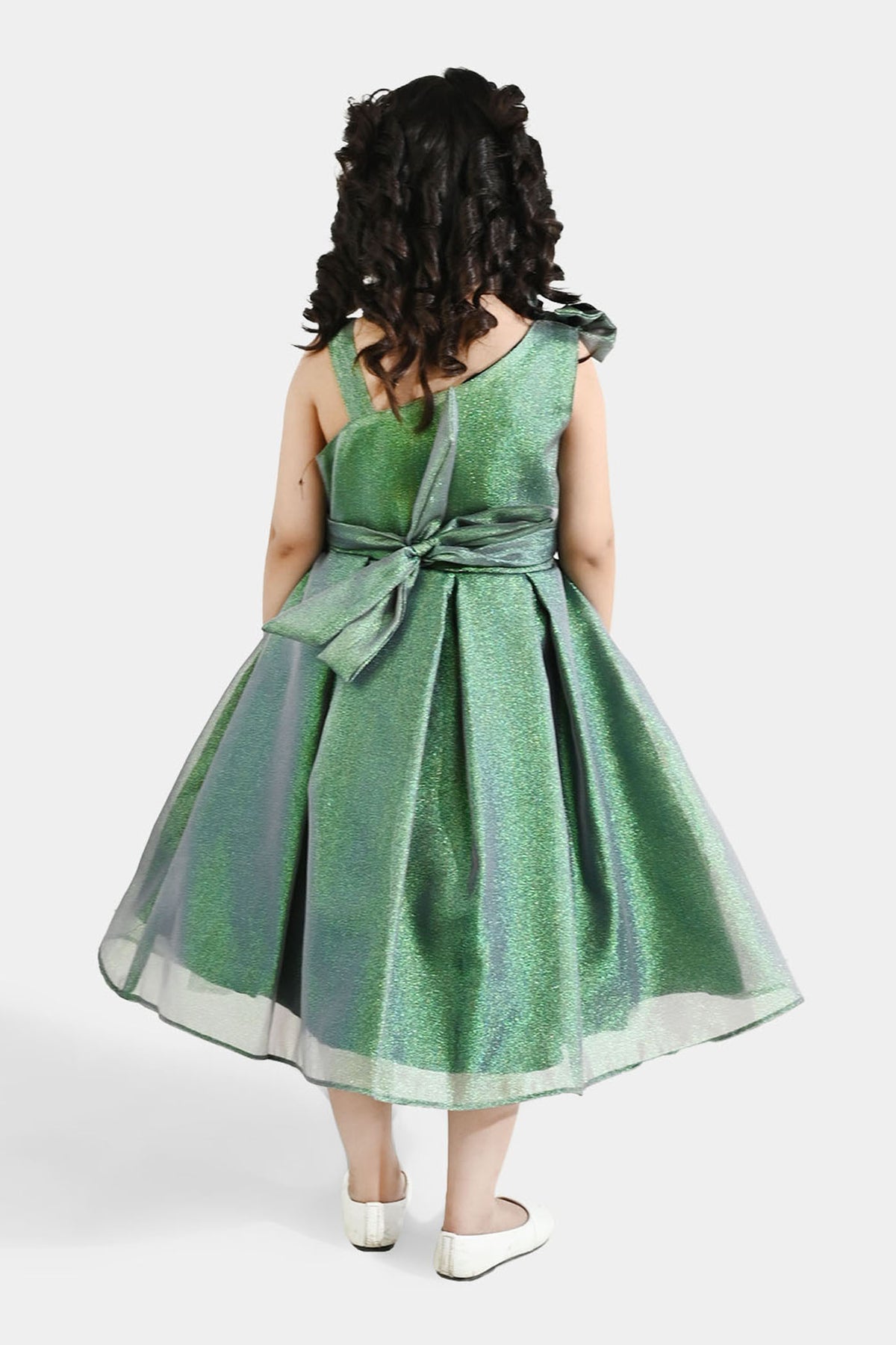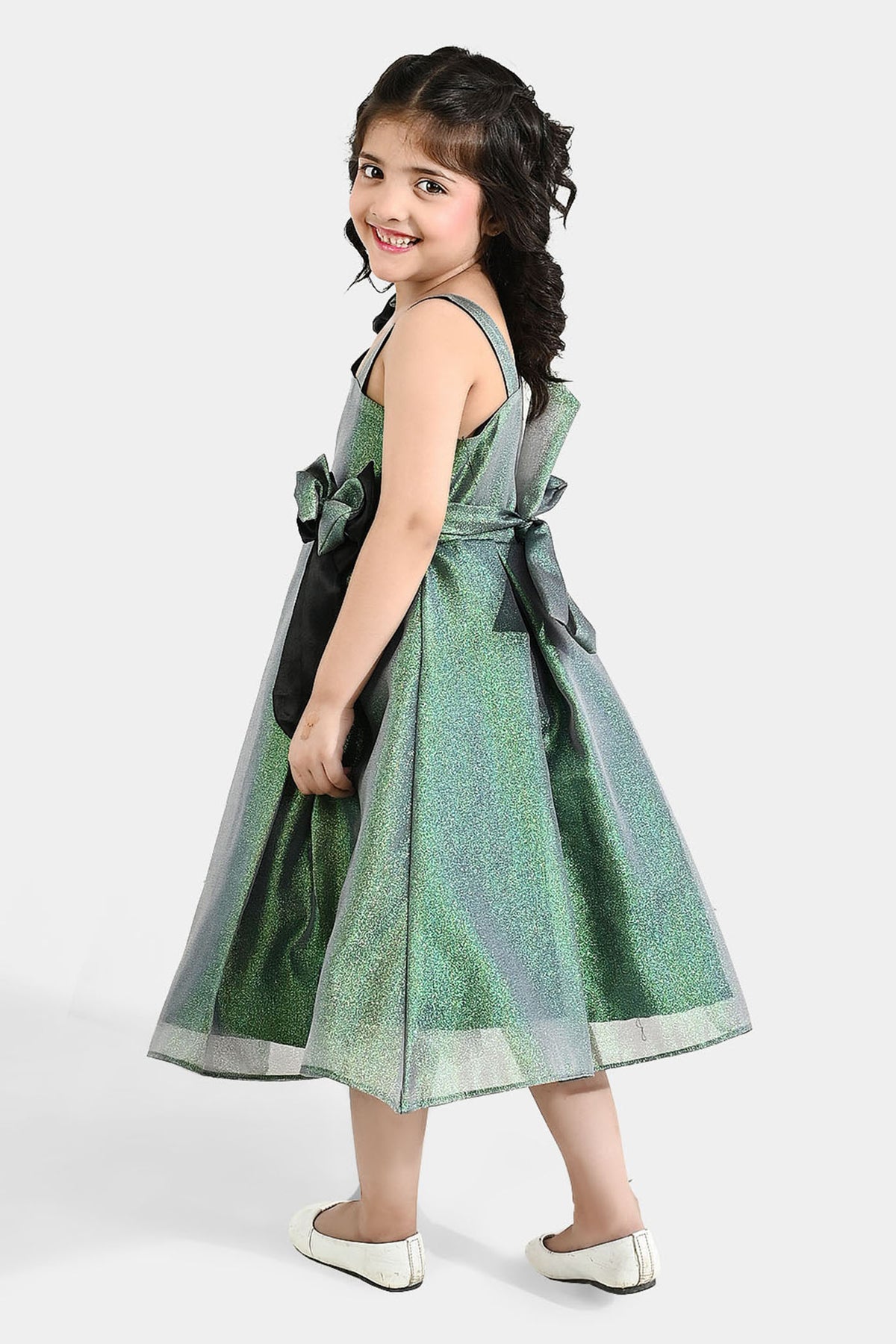 Green and black girls' fancy organza frock featuring a shiny fabric finish, strap design, and bow embellishments on the shoulder and body for a stylish look.