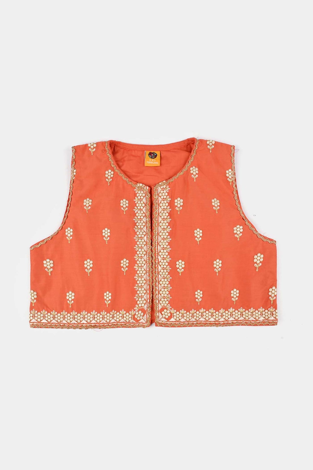 This Noir set is a statement outfit. A vibrant take on festive dressing, blending tradition with a modern twist. Featuring a plain orange shirt, beautifully embroidered koti, and matching Dhaka-style pants.