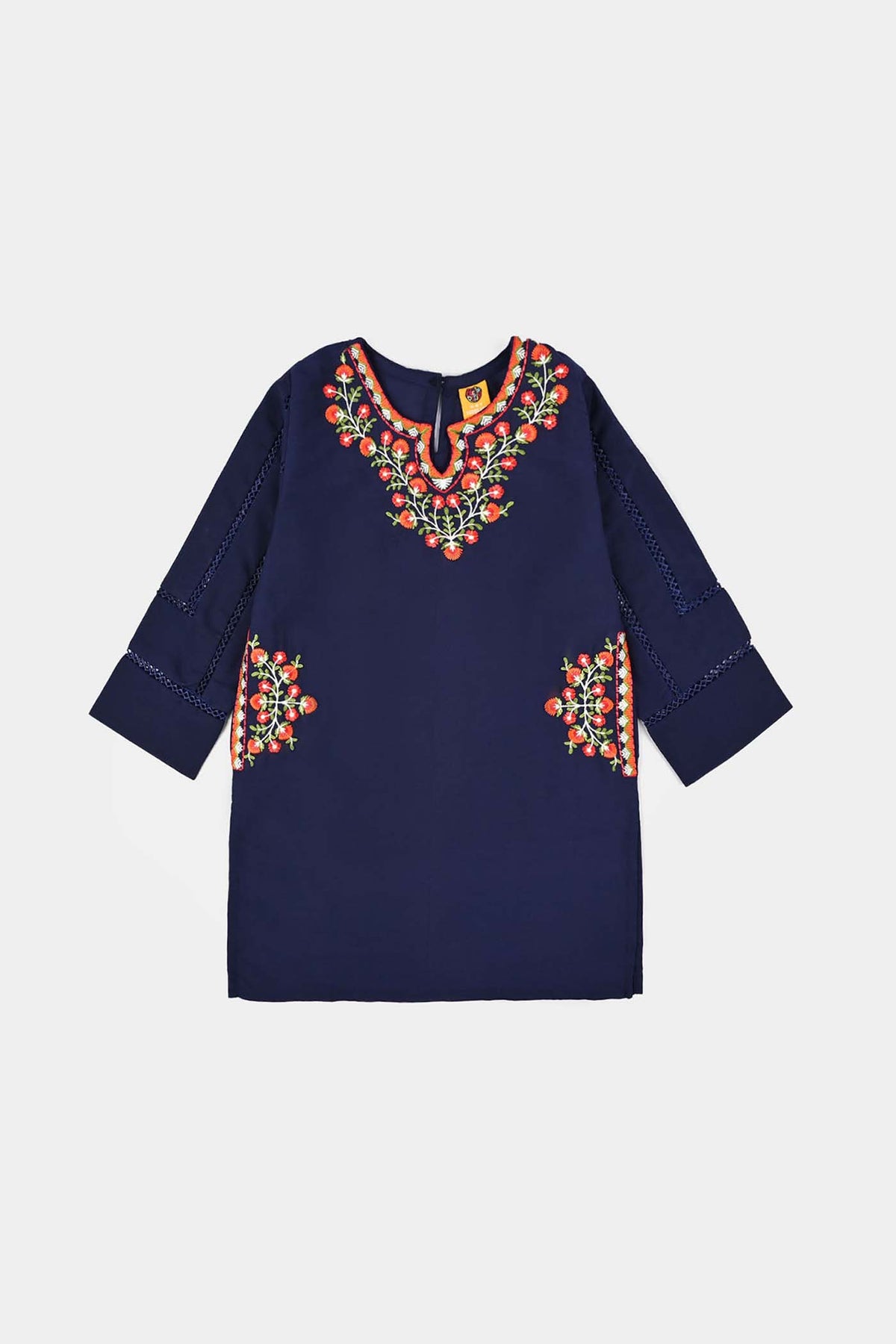 Make a statement with this blue embroidered kurti featuring a round neckline with slit.