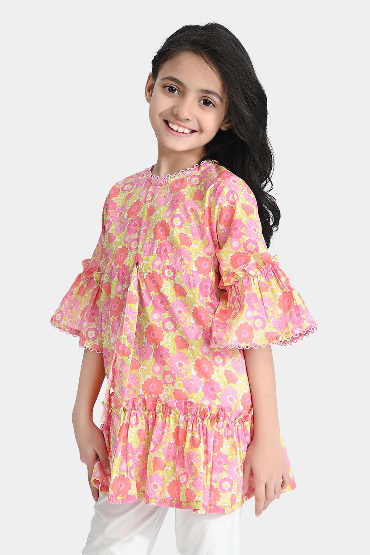 Bloom into floral elegance with this printed kurti. It features a crew neck with frill details on the sleeves and above the hem, creating a flattering fit.