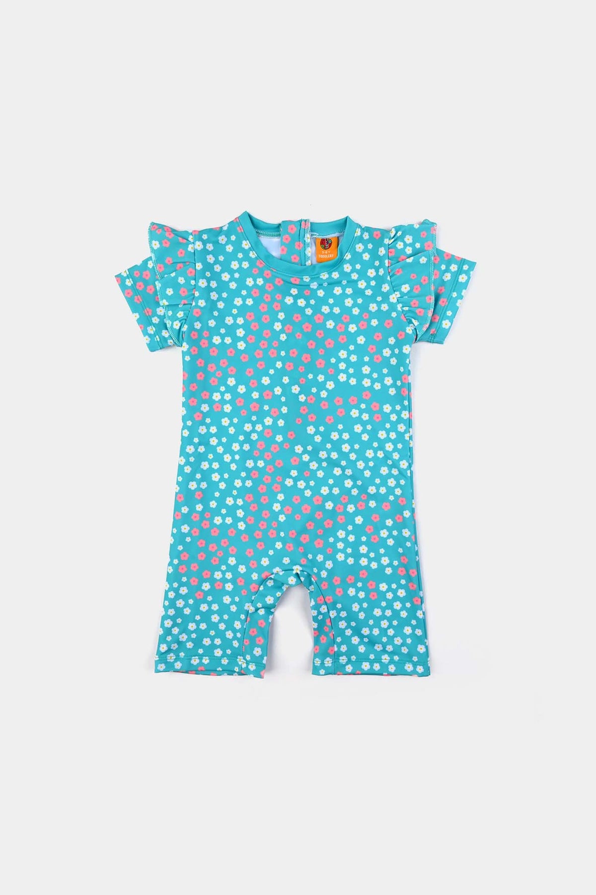 Summer never looked this cute. This romper adds a splash of color and fun style to the wardrobe. Features sweet ruffled sleeves and a playful print on a soft summery fabric.