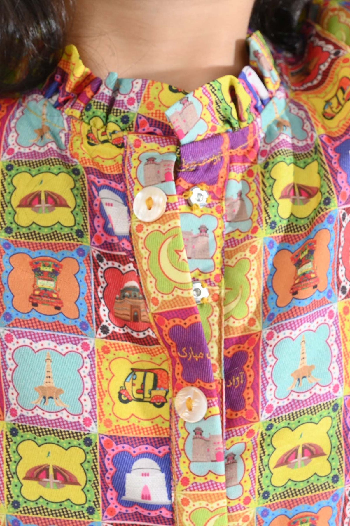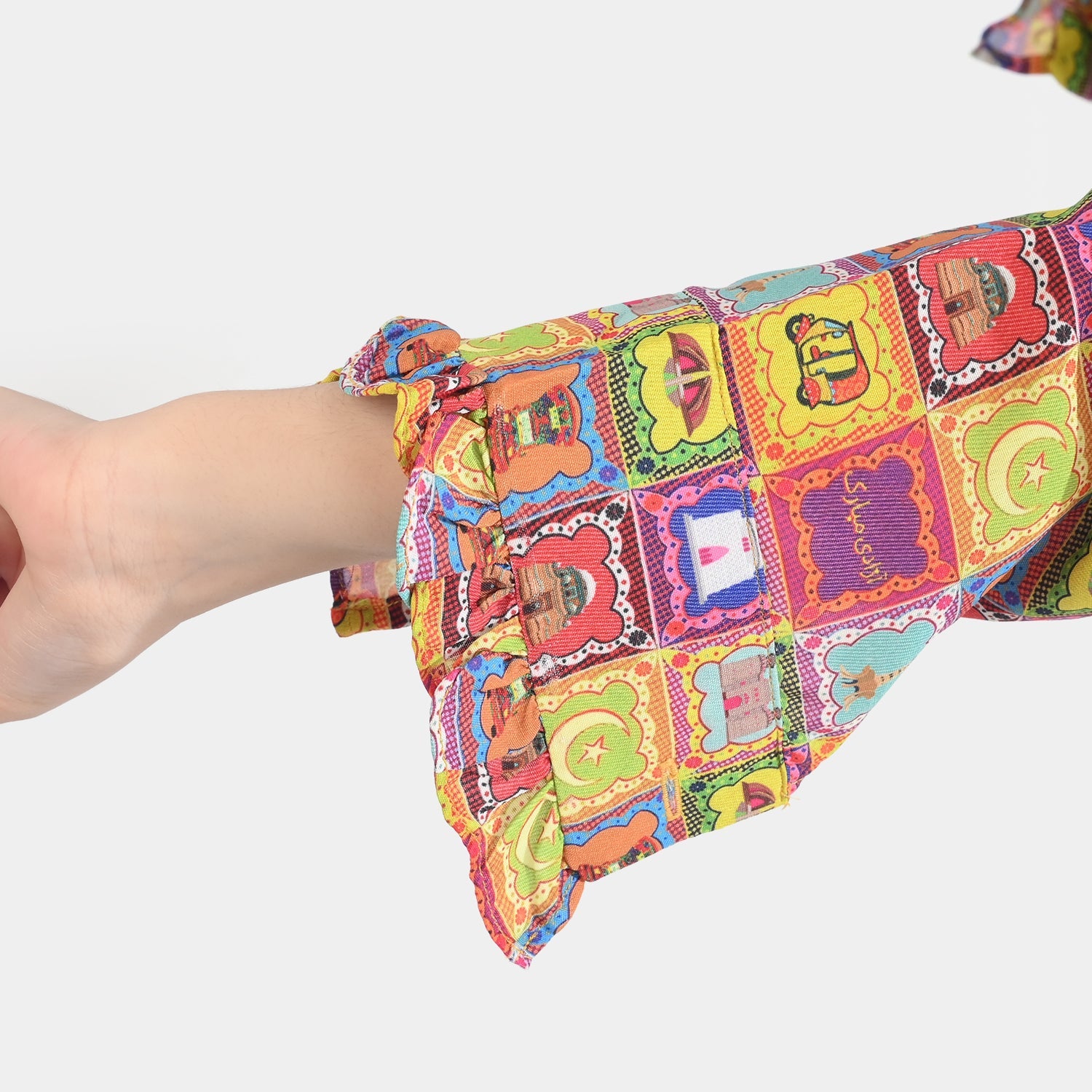Make a cultural style statement with this top, celebrating vibrant heritage. Features frill-trimmed neckline and detailing on the sleeves.
