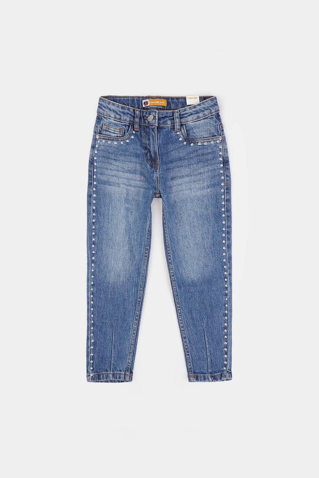 Girls Denim Stretch Pant Side Seams Studs-Mid Blue