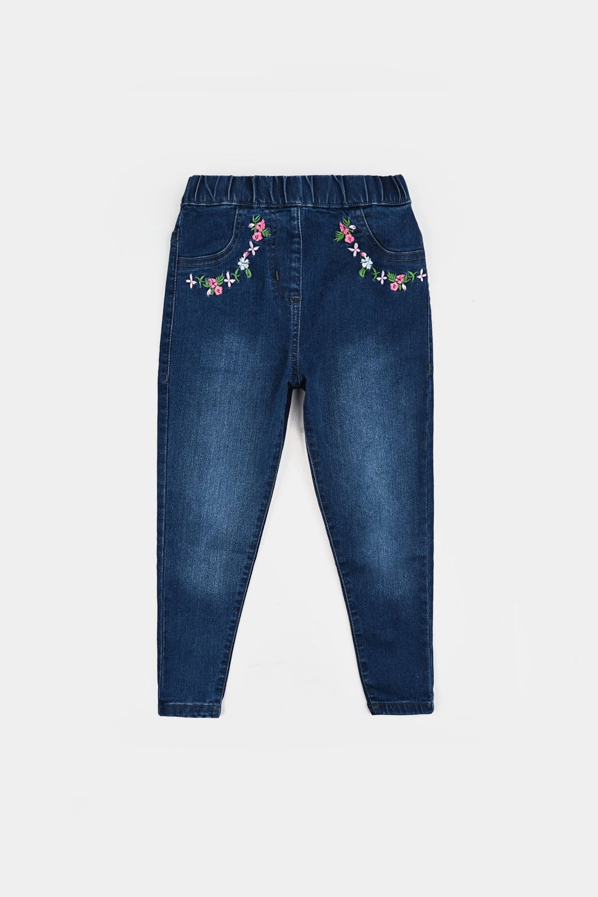 Girls Denim Stretch Jeggings Pocket Flower - Mid Blue