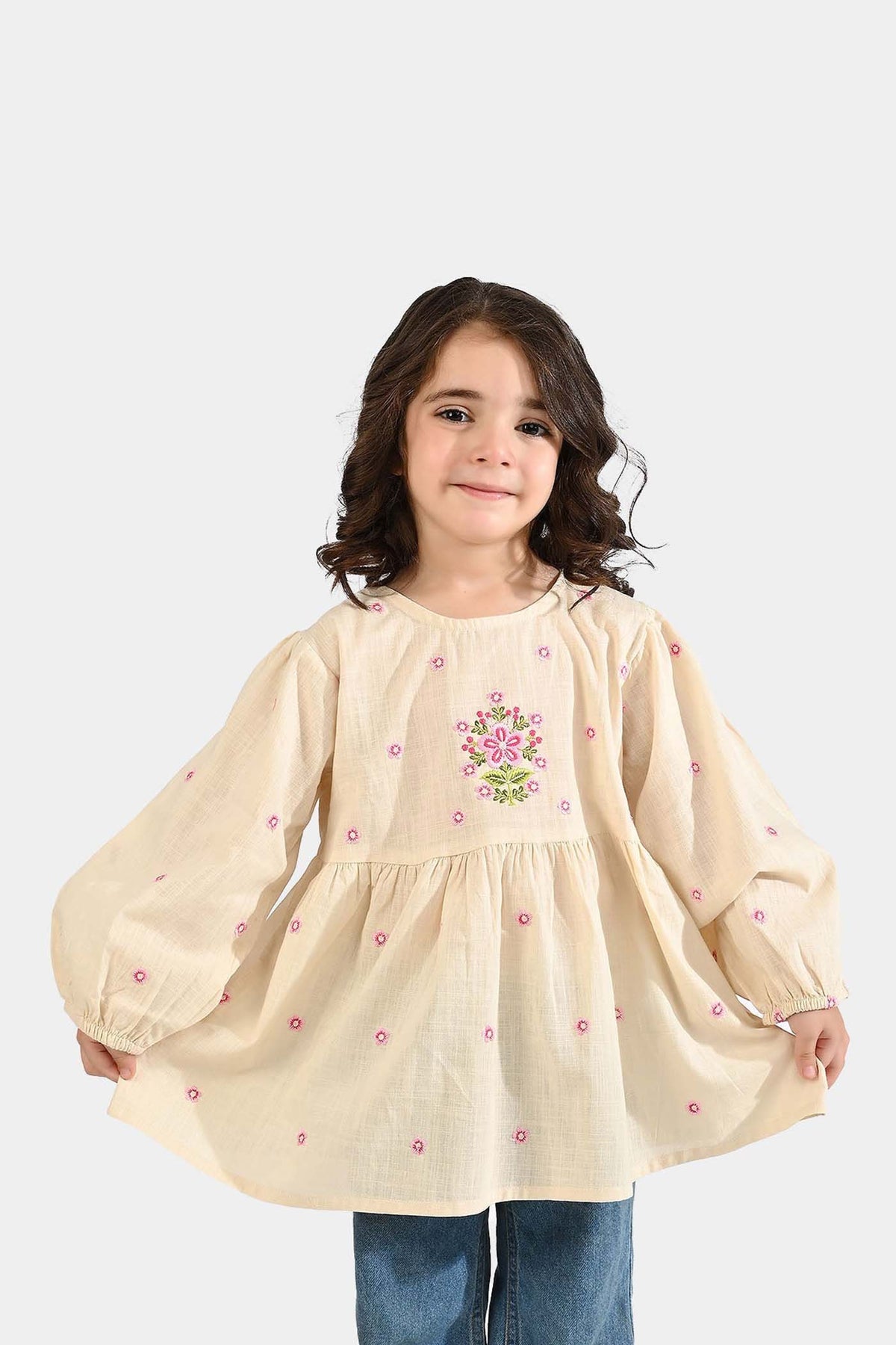 Off-white cotton slub featuring a floral embroidered top, peplum design with a round neckline and full sleeves. Perfect for pairing with tights or pants.