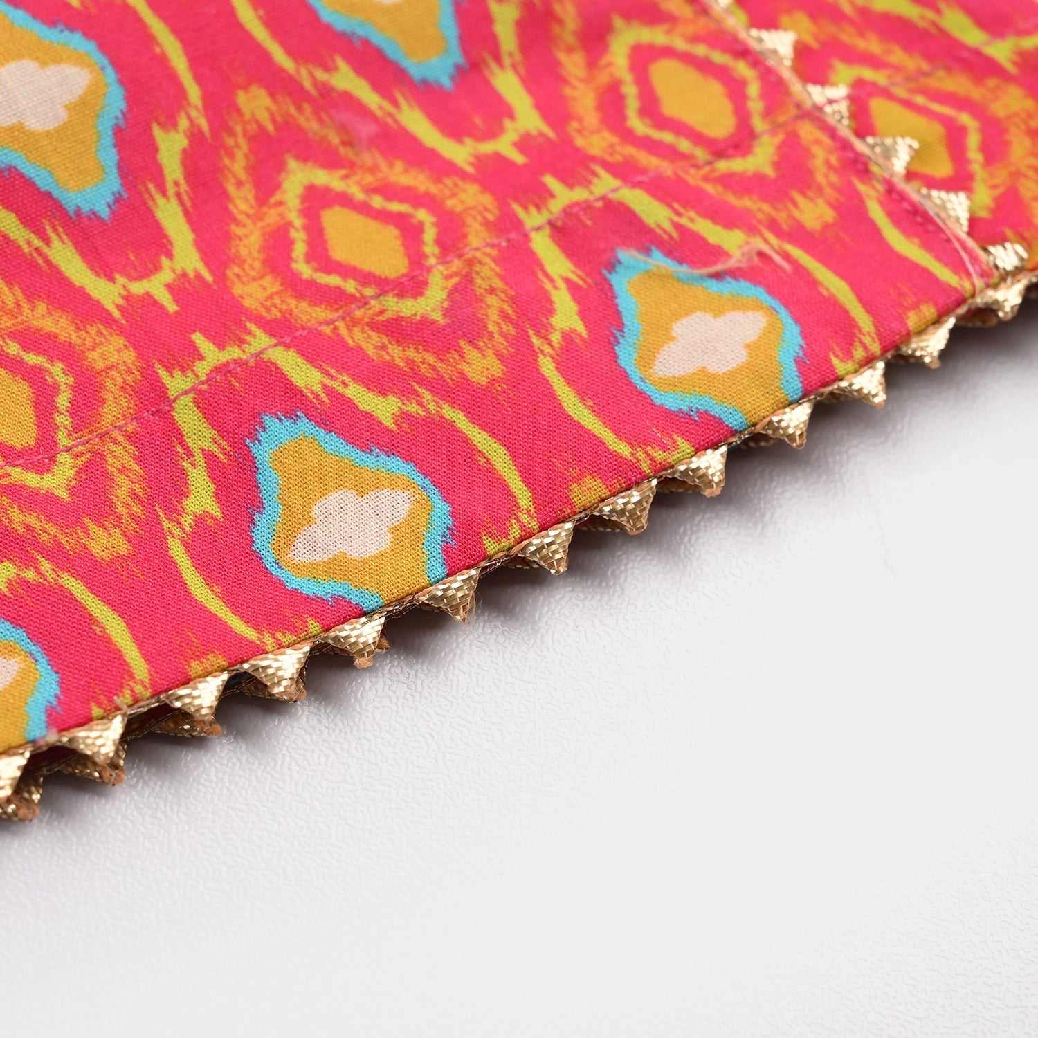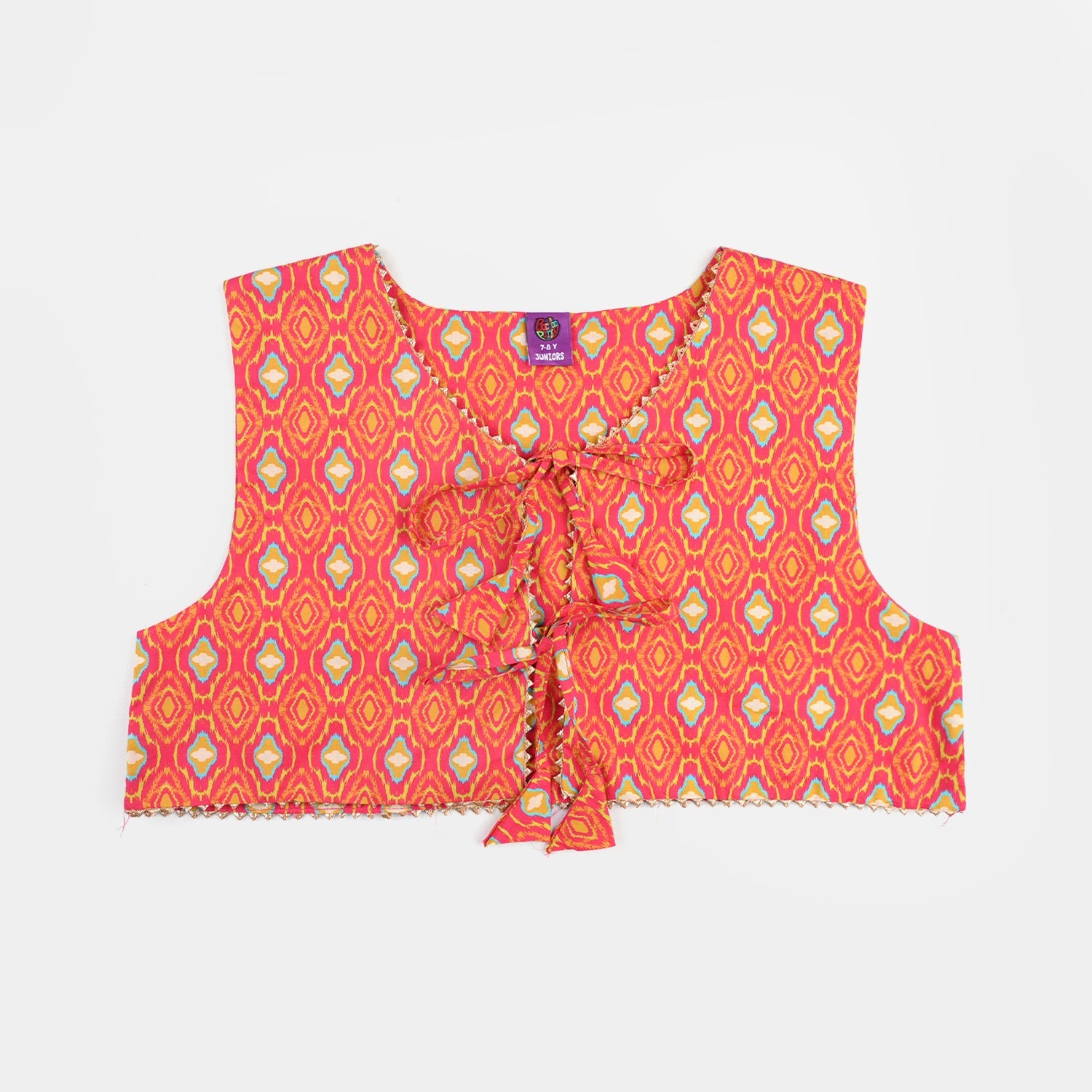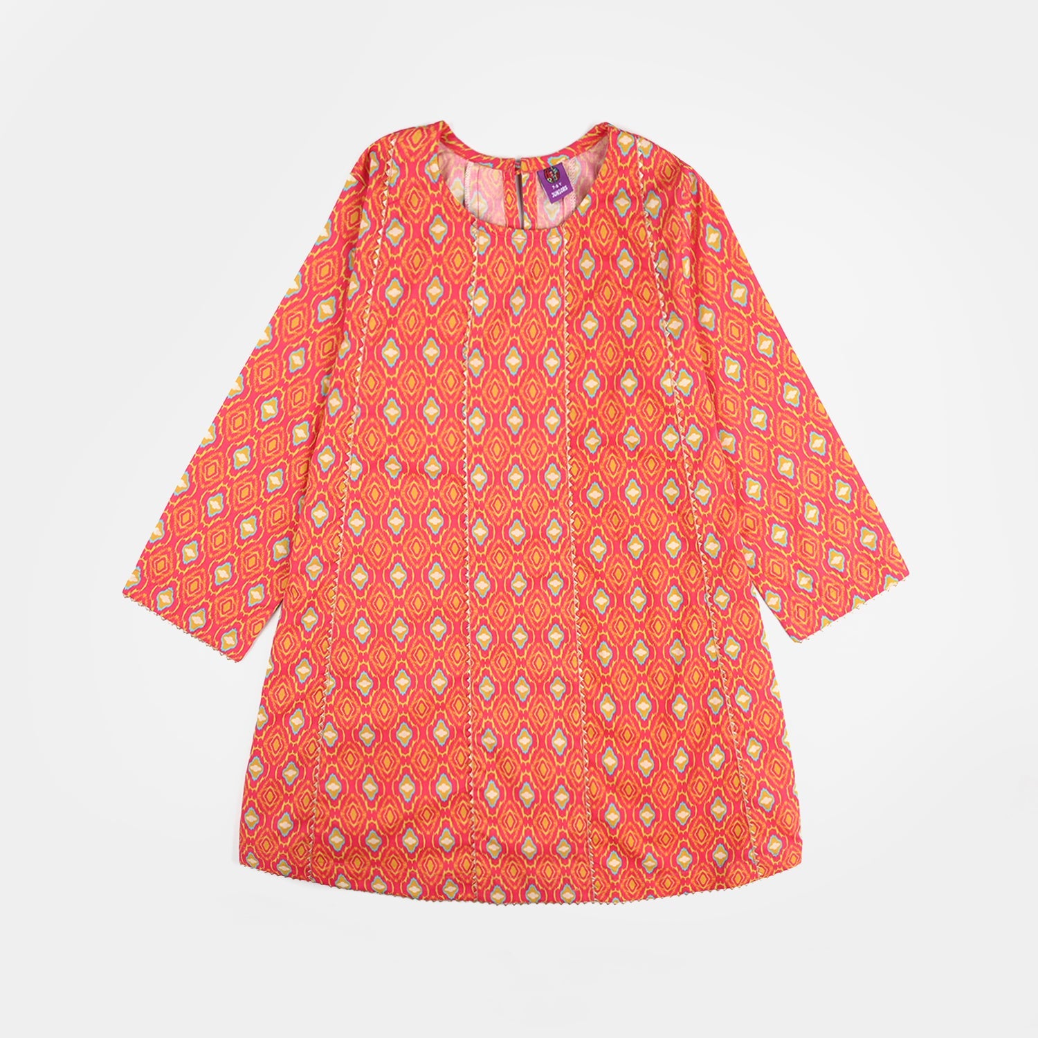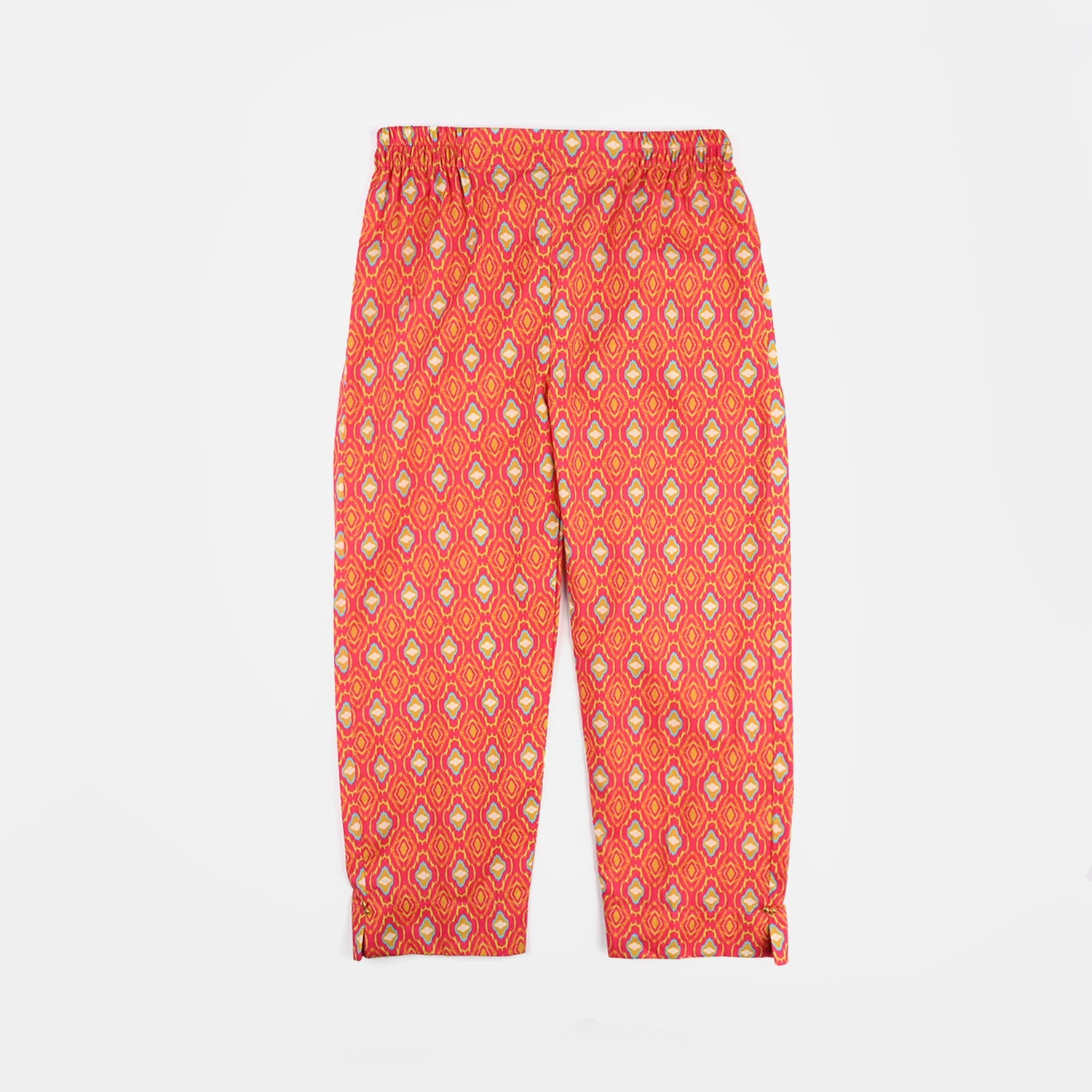 Orange 3-piece girls set featuring a printed shirt with a round neck and full sleeves, matching trousers, and a sleeveless koti for a complete traditional look.