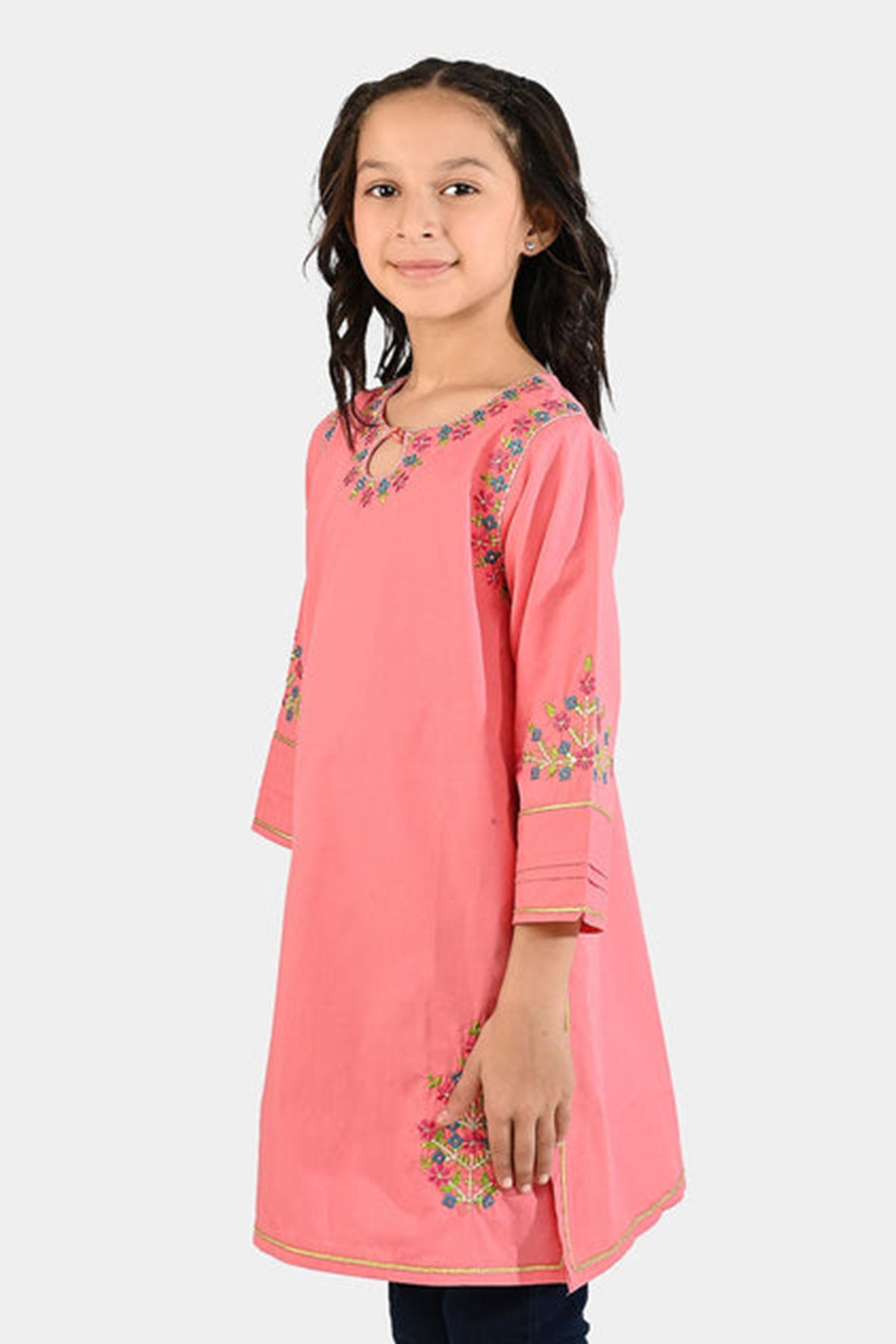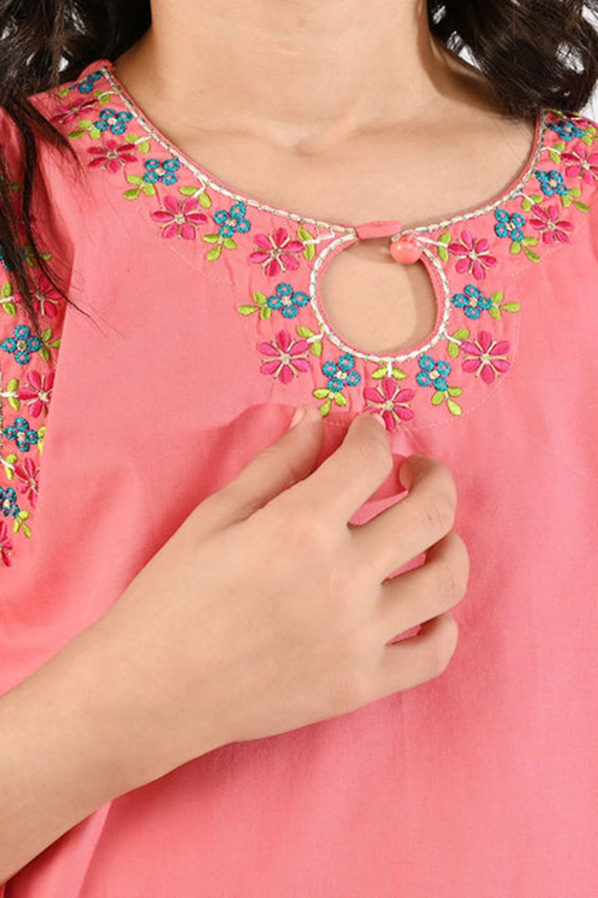 Peach poplin cotton embroidered kurti featuring an embroidered neckline and quarter sleeves, easy to pair with leggings or trousers for a simple and elegant look.