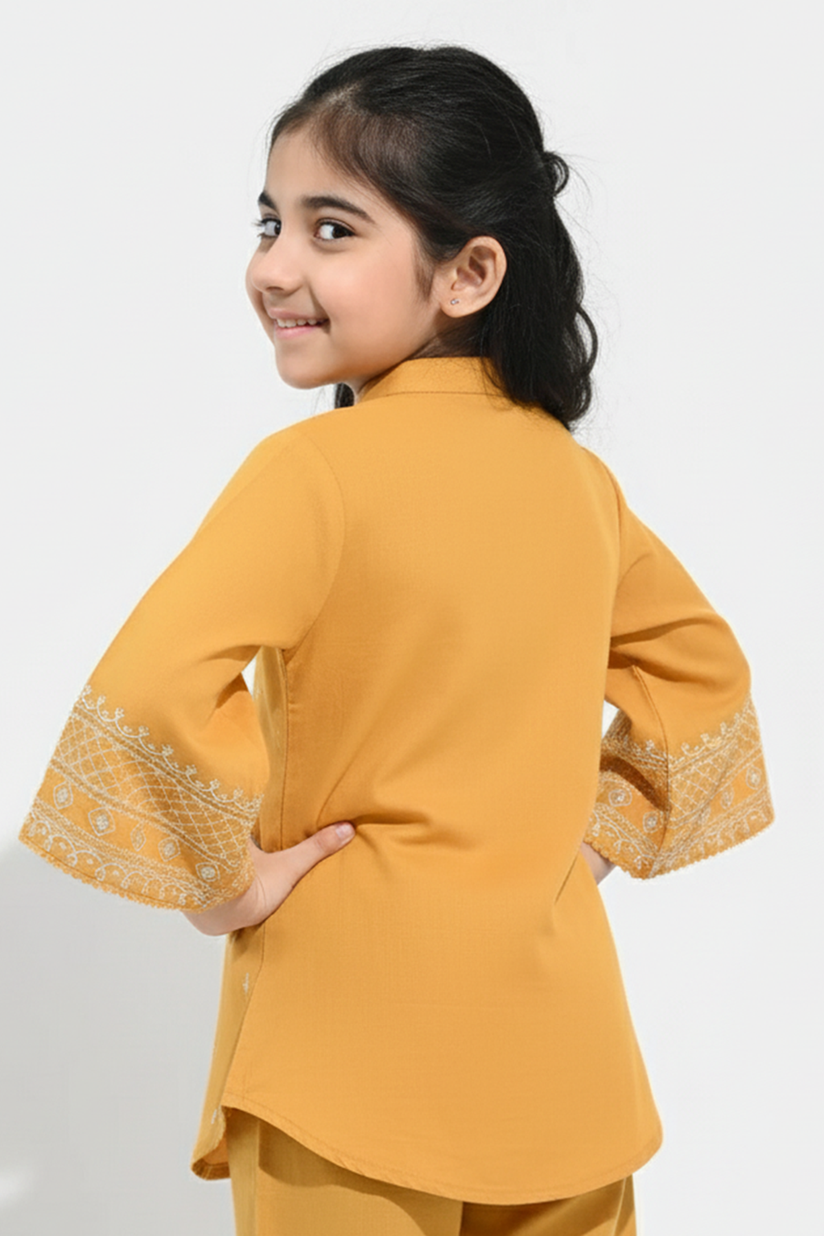 This mustard top features dainty embroidery at the front and sleeves borders and rounded hem silhouette for a chic look.