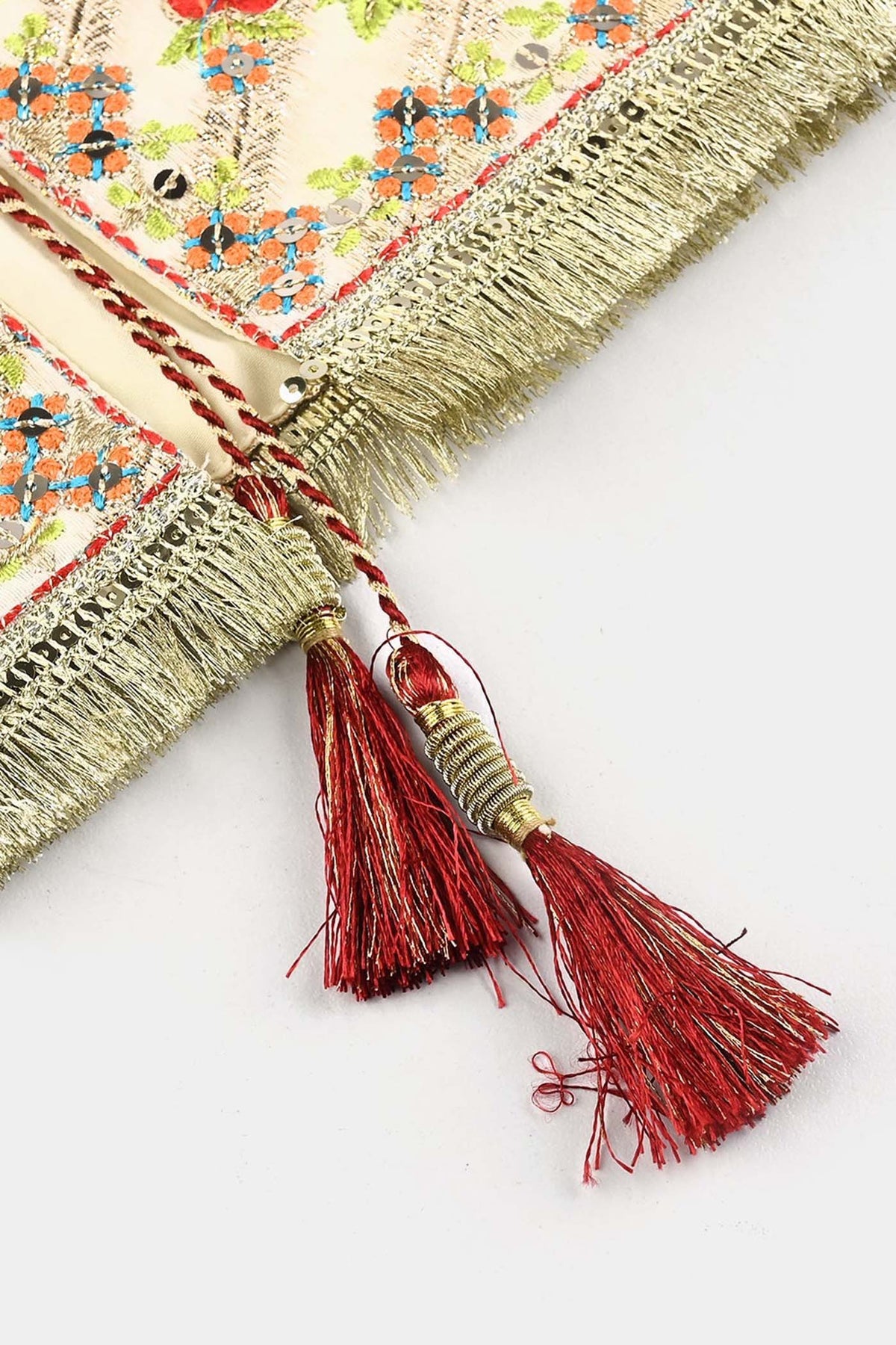 Jacquard 4-piece set in red featuring a long frock with a round neckline and embroidered sleeves, paired with straight pants for an elegant look. The contrasting dupatta and intricately embroidered coati with delicate dori detailing complete this perfect outfit for special occasions.