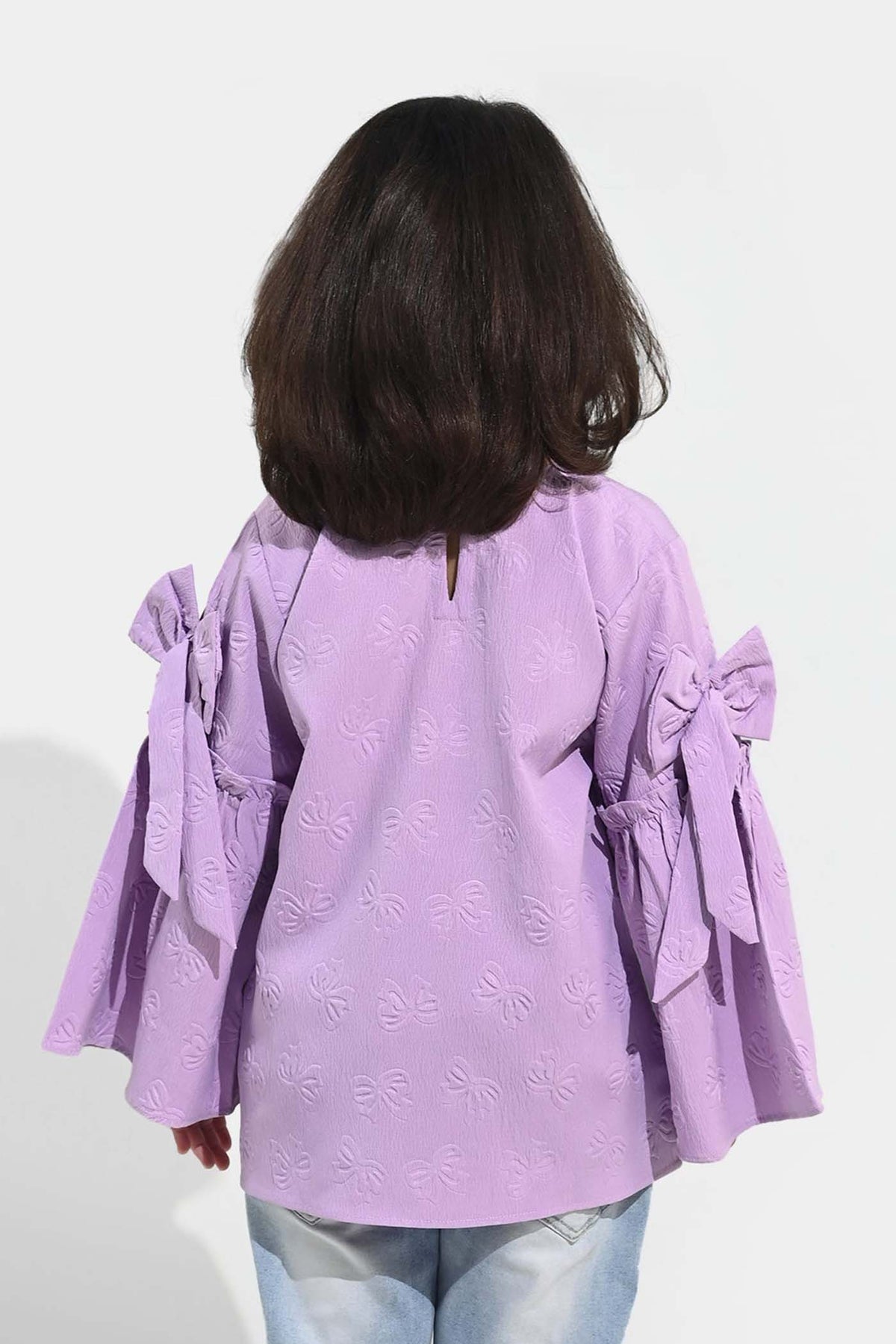 Stand out with this Lavender Dreams top made of self-embossed fabric, featuring dramatic sleeves and a ribbon applique. Perfect for a casual day out.