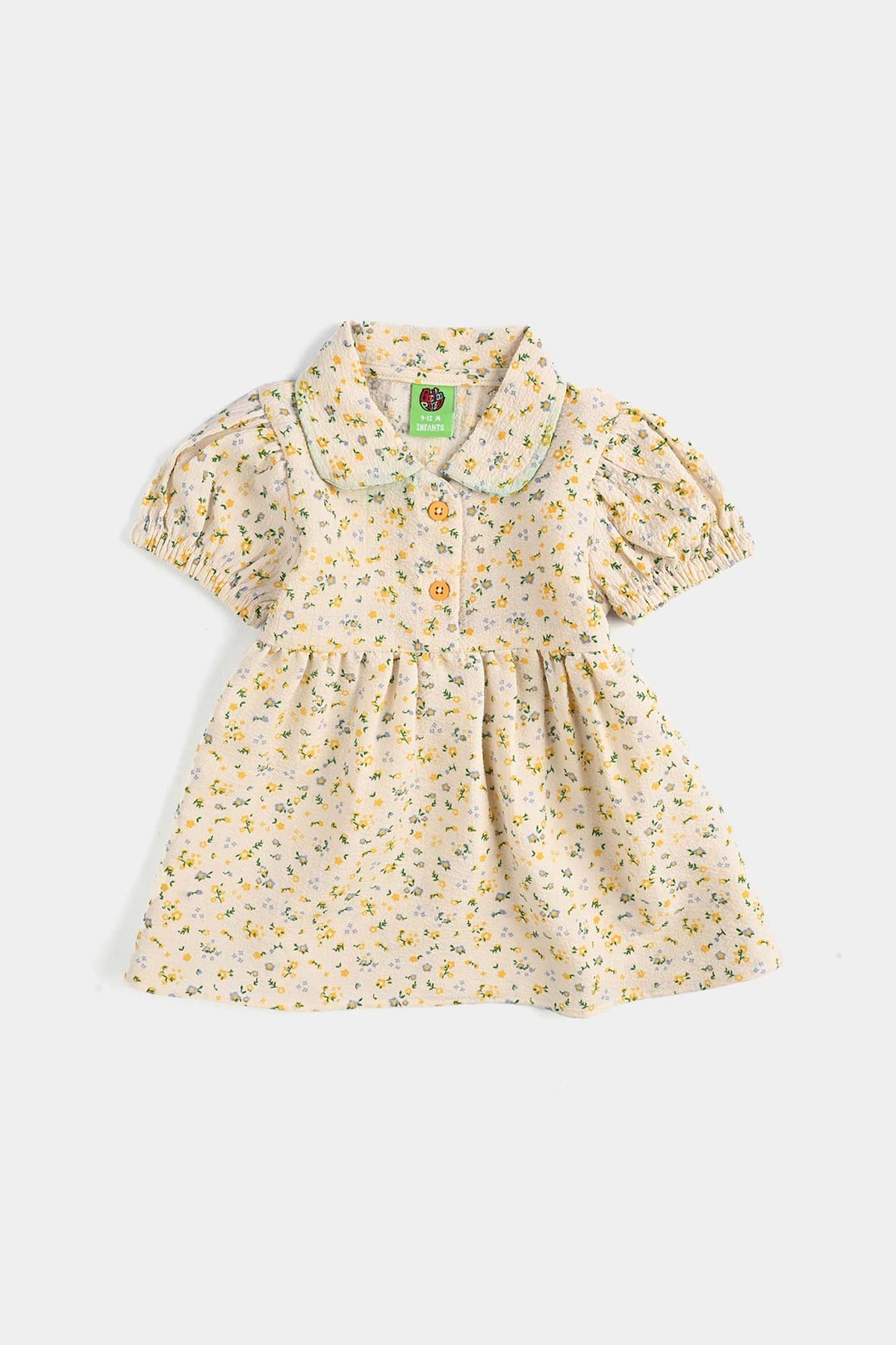 This cute white dress has a yellow and green floral print. Features sweet short puff sleeves and a peplum silhouette. Perfect for those sunny days filled with play.