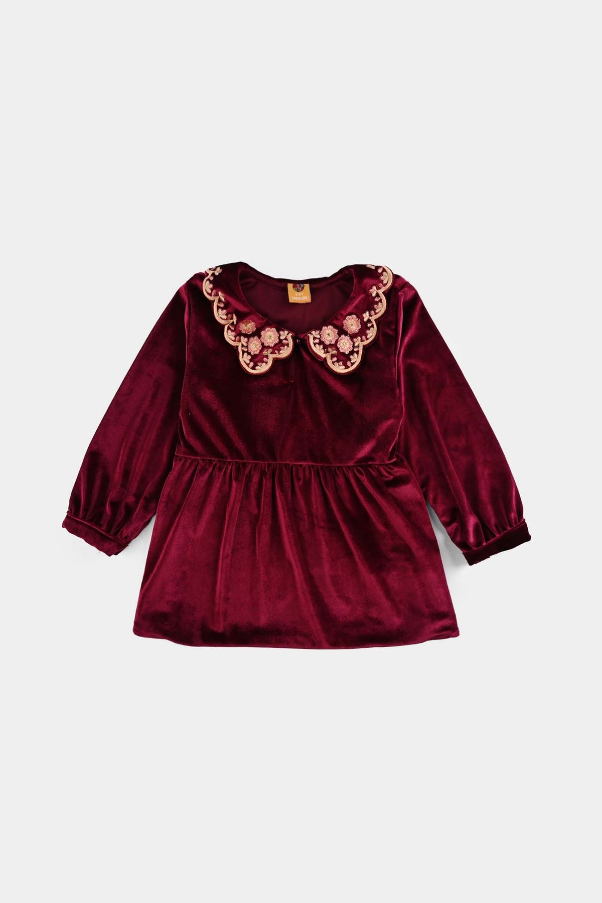 Maroon velvet embroidered top featuring an embroidered collar, peplum style, and elastic-finished sleeves for a comfortable and elegant look.