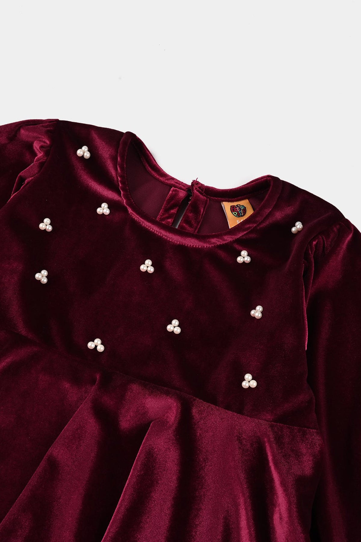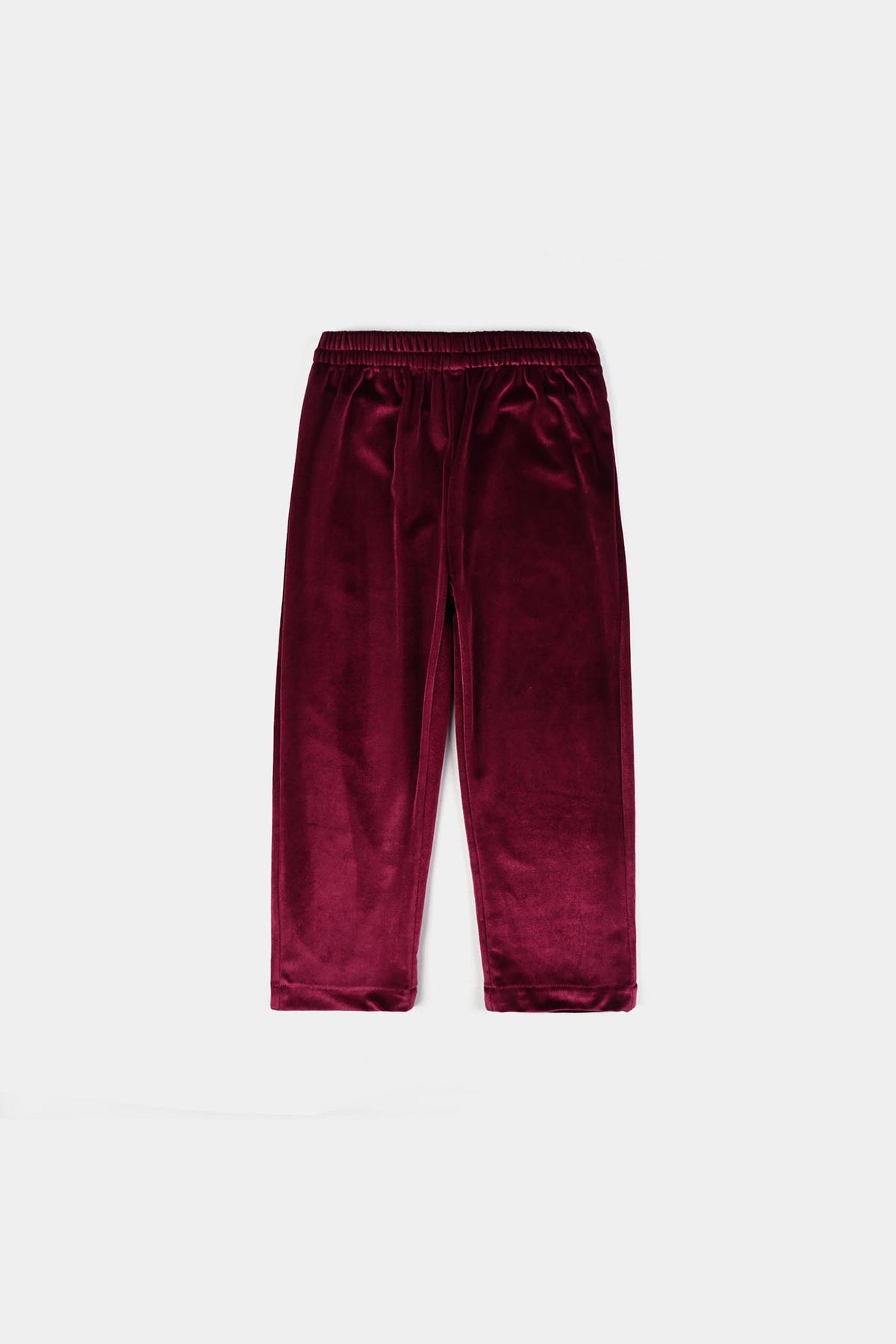 Rich velvet, timeless charm. This maroon peplum shirt paired with matching trousers makes a graceful, cozy set for festive evenings and special occasions.