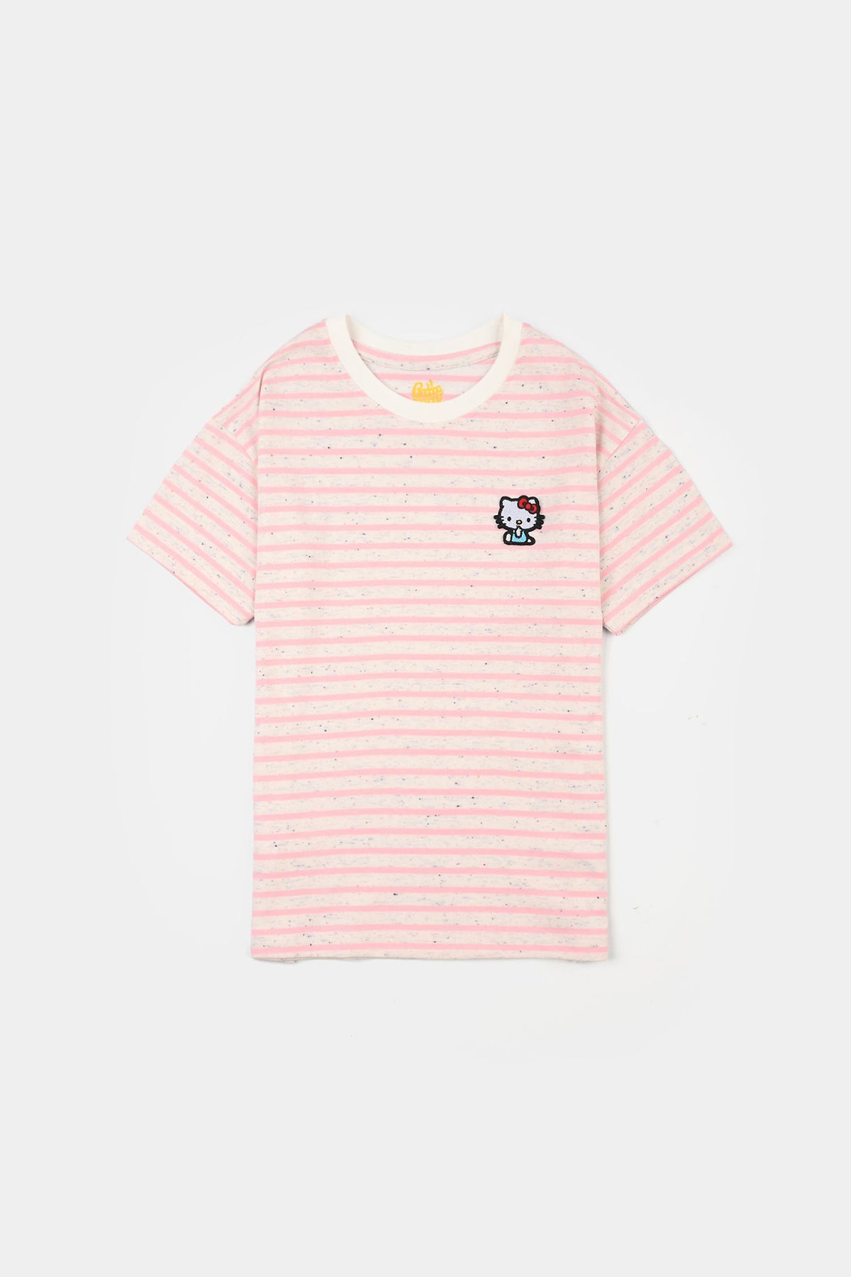 Girls’ china fabric T-shirt in pink stripes, featuring a round neck, half sleeves, and a Hello Kitty front graphic.