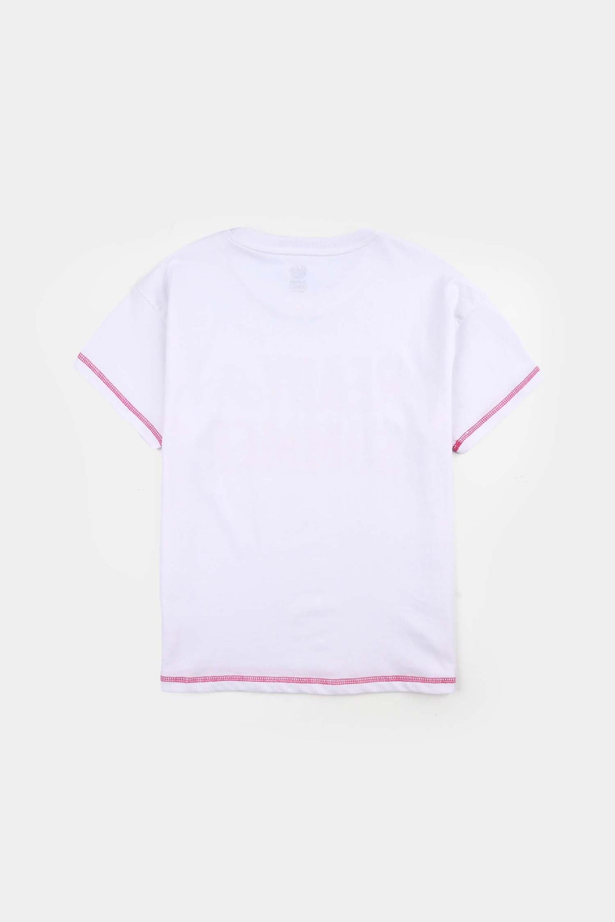 Girls’ white jersey/terry T-shirt with a round collar, half sleeves, printed front design, and pink stripe detailing on the sleeves and hem.