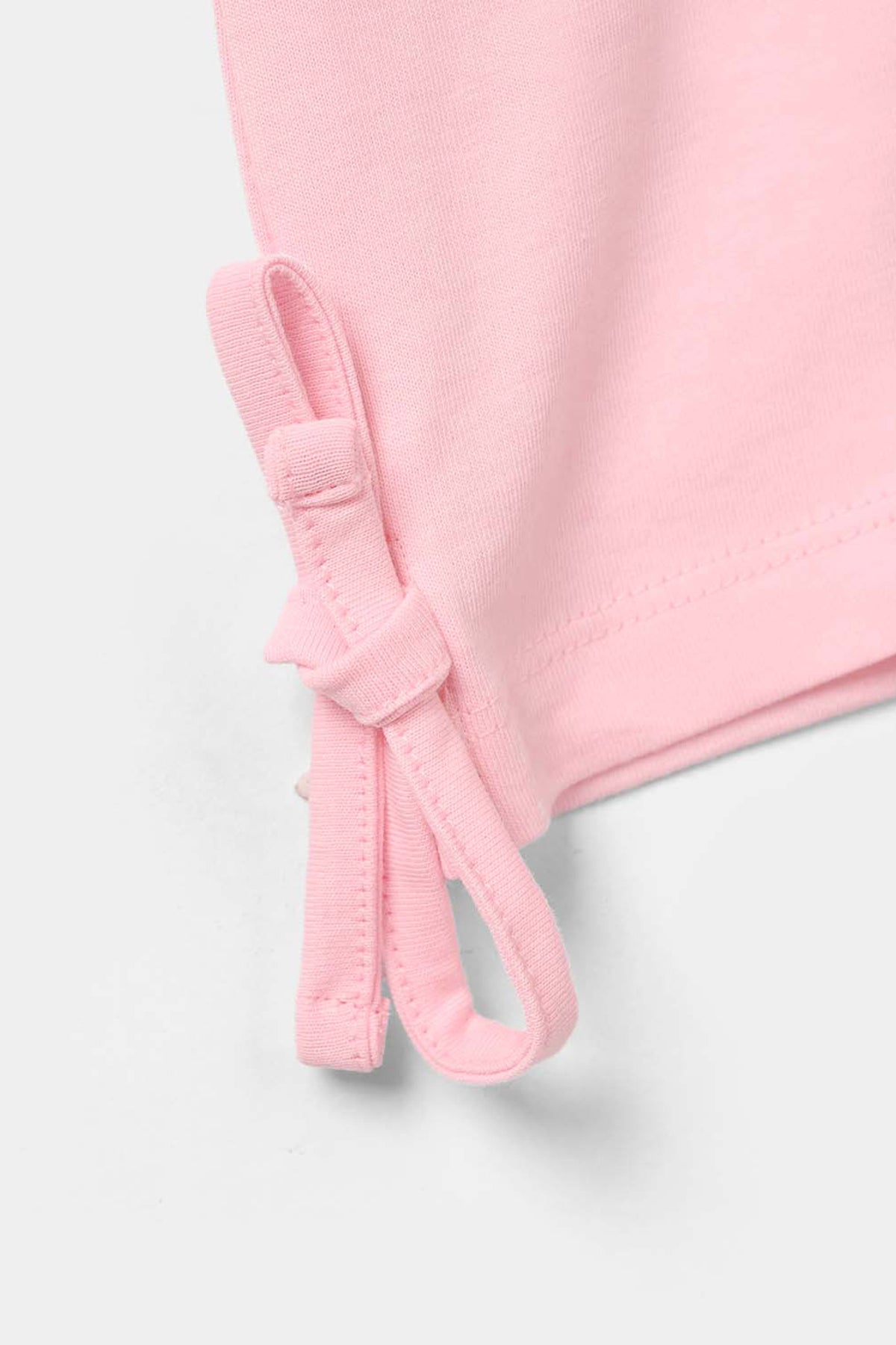 Girls’ baby pink shirt featuring front “Resort Sunset” embroidery, half sleeves, and cute side bows on the hem. Easy to pair with any bottoms for a stylish everyday look.