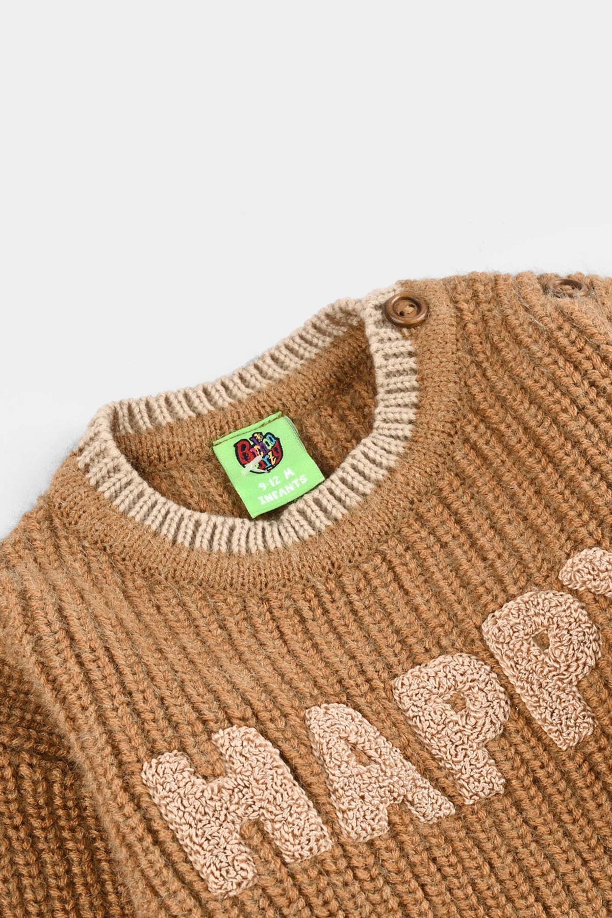 Warmth with a smile. This light brown sweater is soft, cozy, and designed to brighten chilly days with cheerful charm.