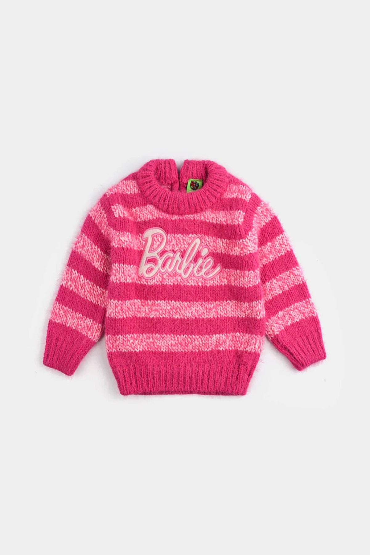 Sweet and sparkly. This pink sweater is adorned with Barbie charm, bringing warmth and style for a cozy-chic look.
