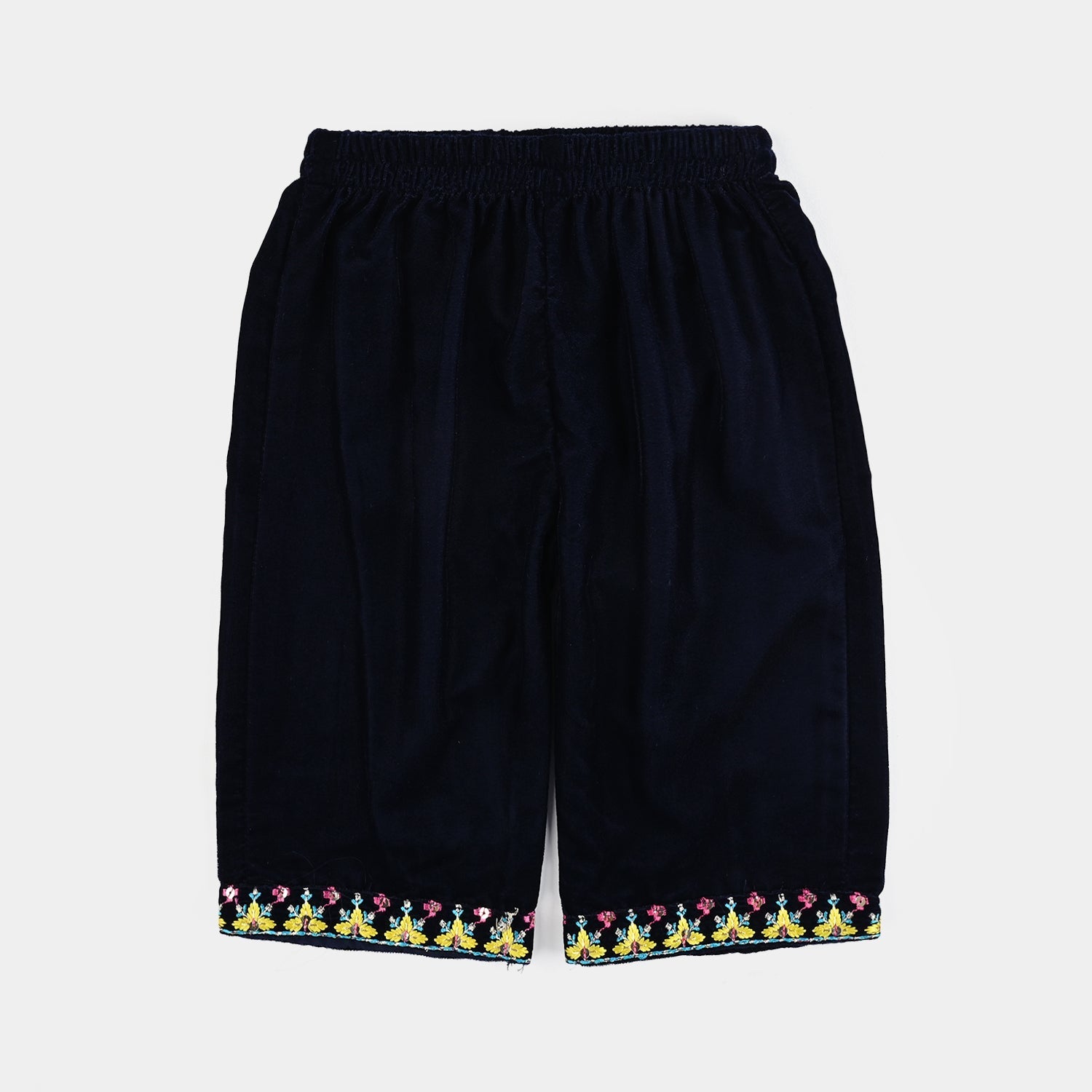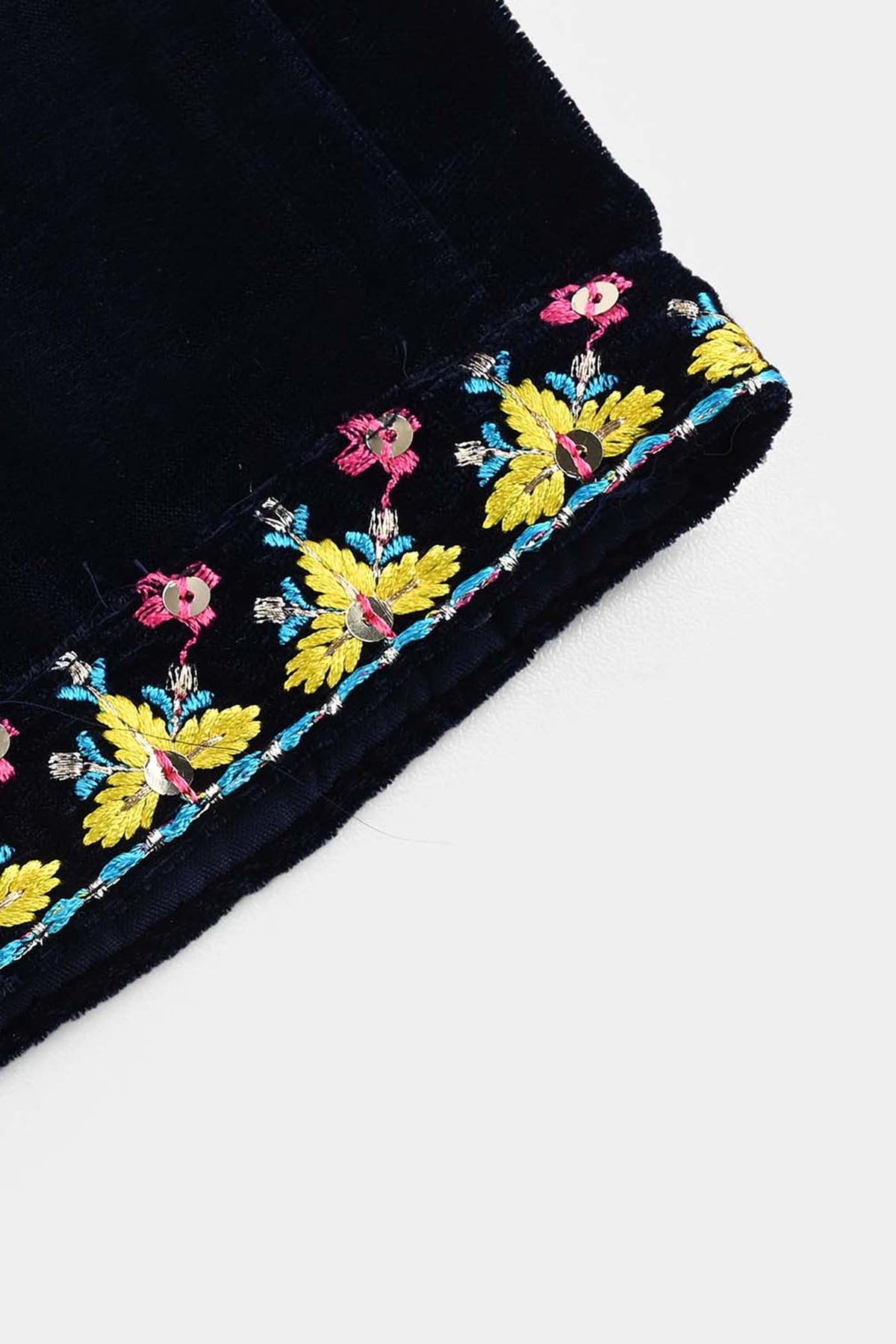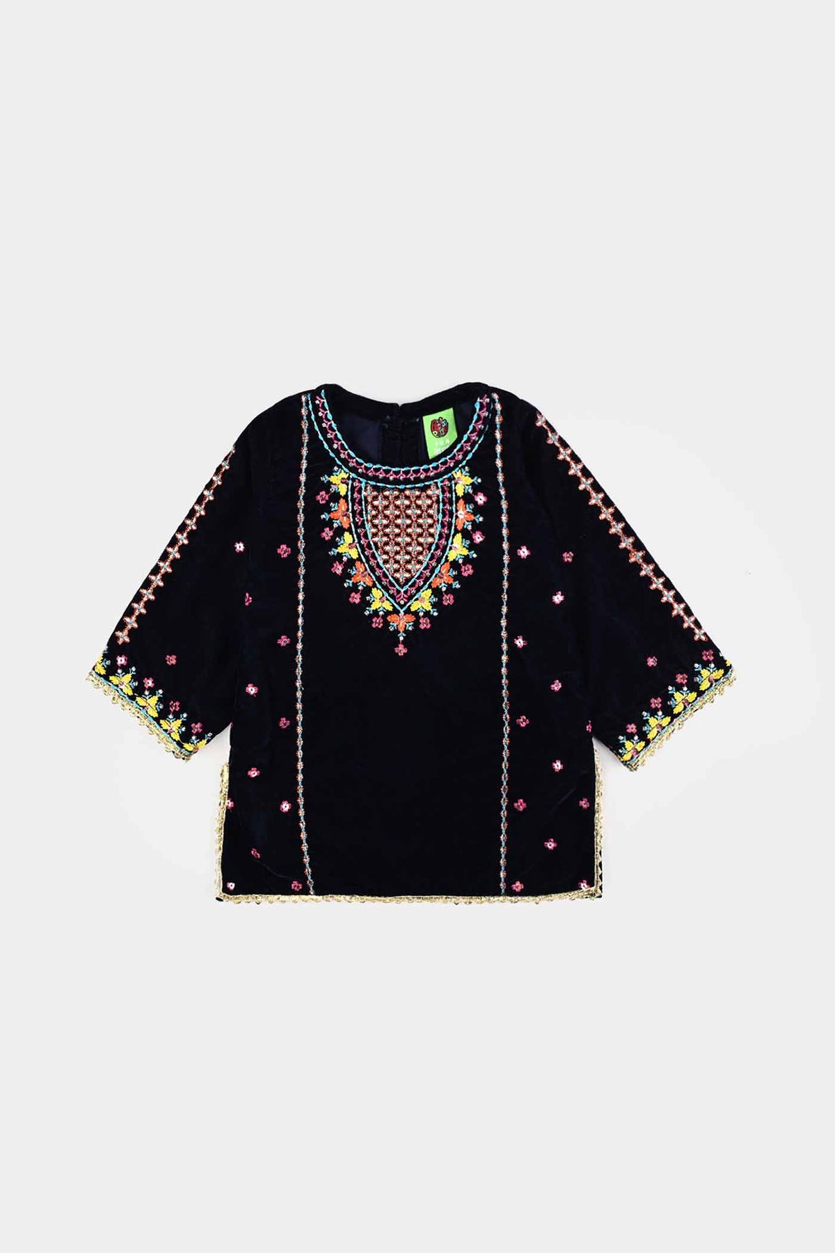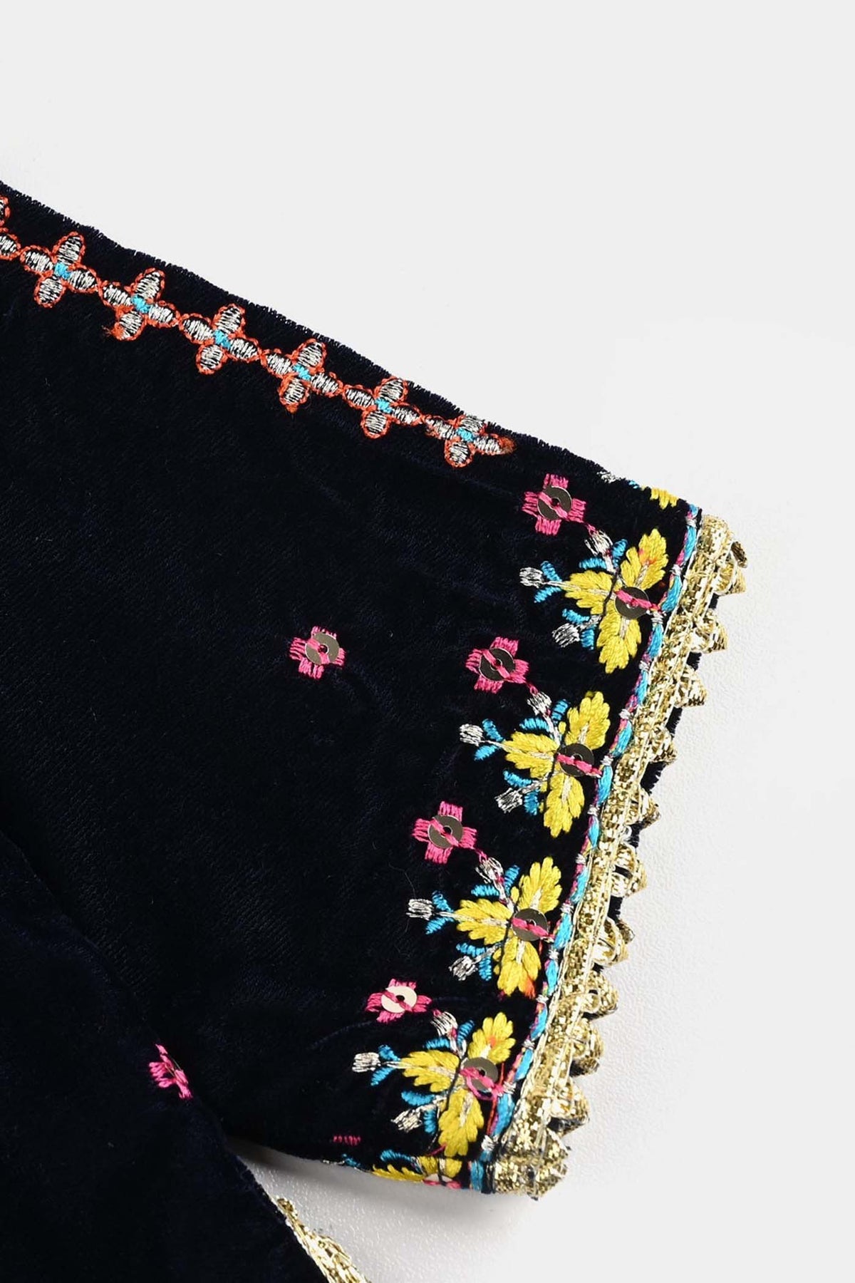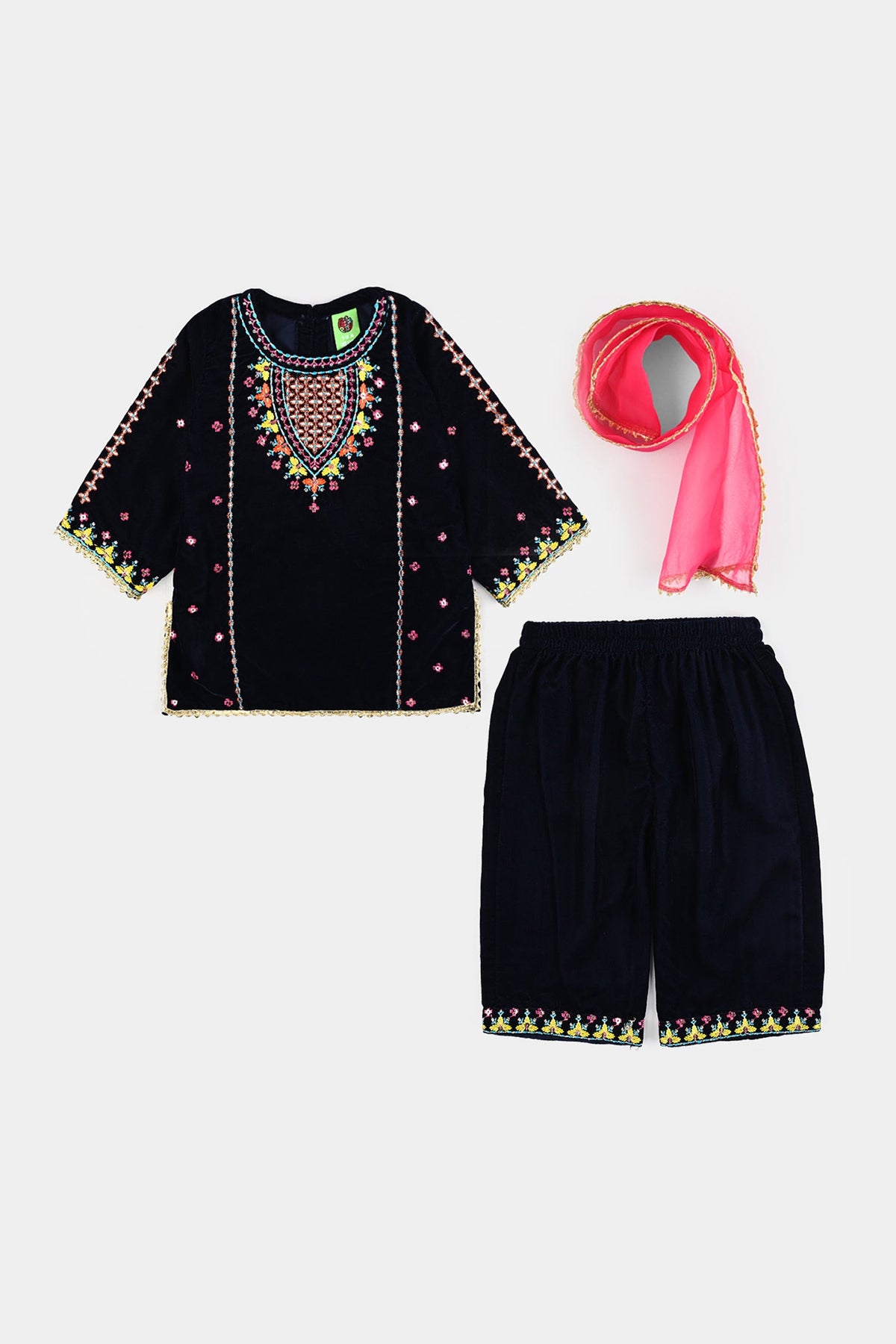 Wrap your little one in cozy elegance with this Velvet 3-Piece Set. Perfect for keeping her warm and stylish through the winter season. The soft velvet shirt features a round embroidered neckline, full sleeves, and beautifully detailed front panels. Paired with an embroidered shalwar and a contrasting dupatta, it creates a graceful, charming look that’s as comfortable as it is adorable. A lovely outfit for special occasions or winter gatherings.