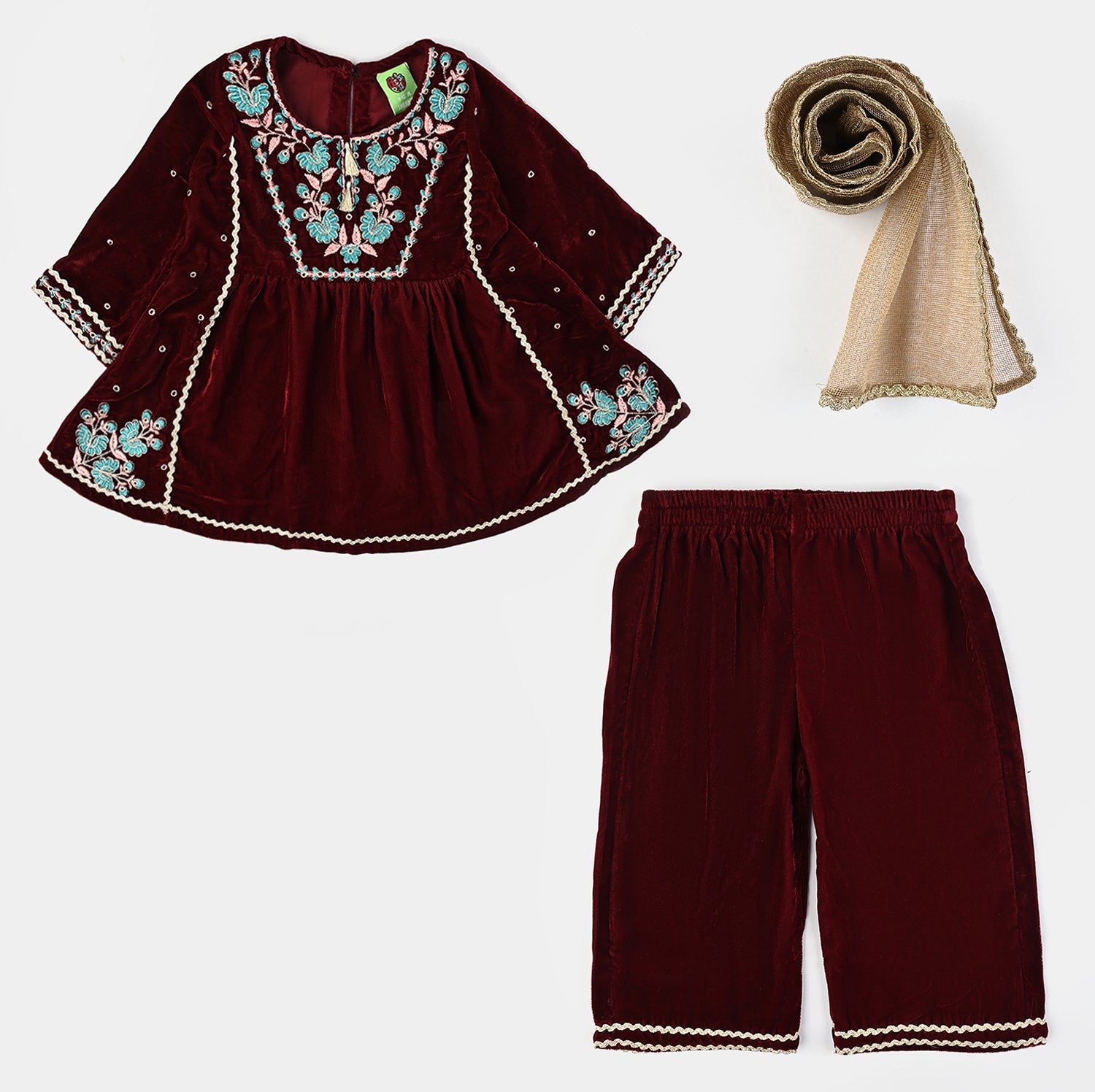 Infant Girls Velvet Fancy 3Pcs Gumaan-MAROON