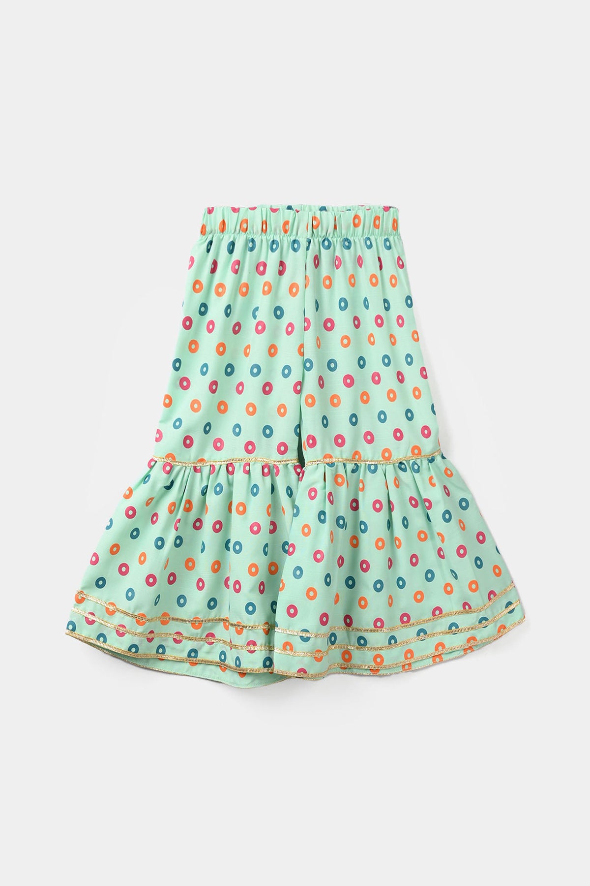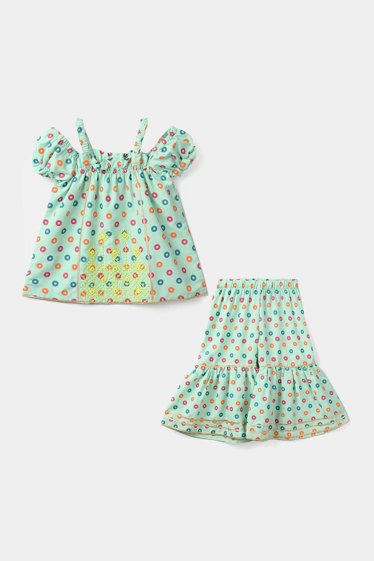 This green printed infant 2-piece features an off-shoulder frock-style top with front embroidery and lace embellishment, paired with a matching gharara finished with delicate lace detailing.
