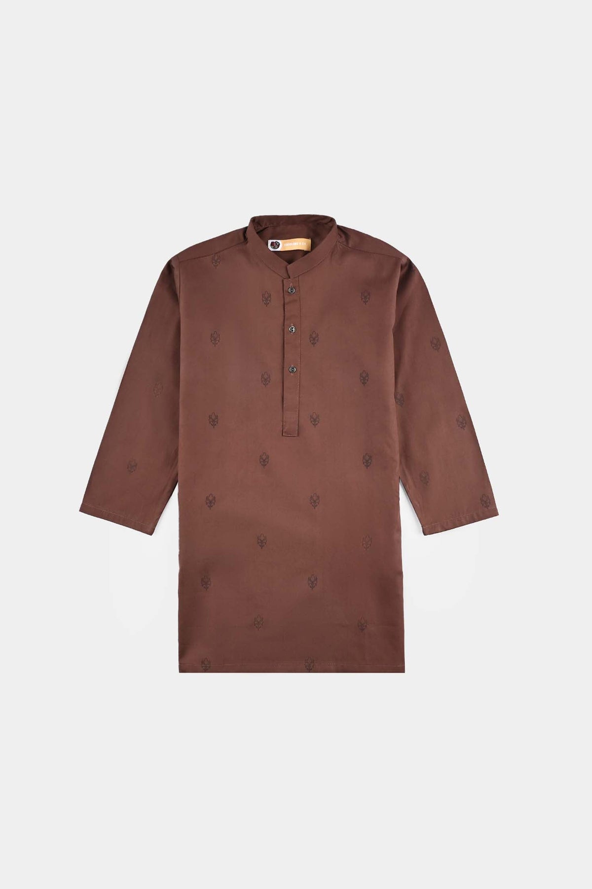 Experience sophistication in every stitch with this dark brown self-print kurta. Perfect for any occasion.