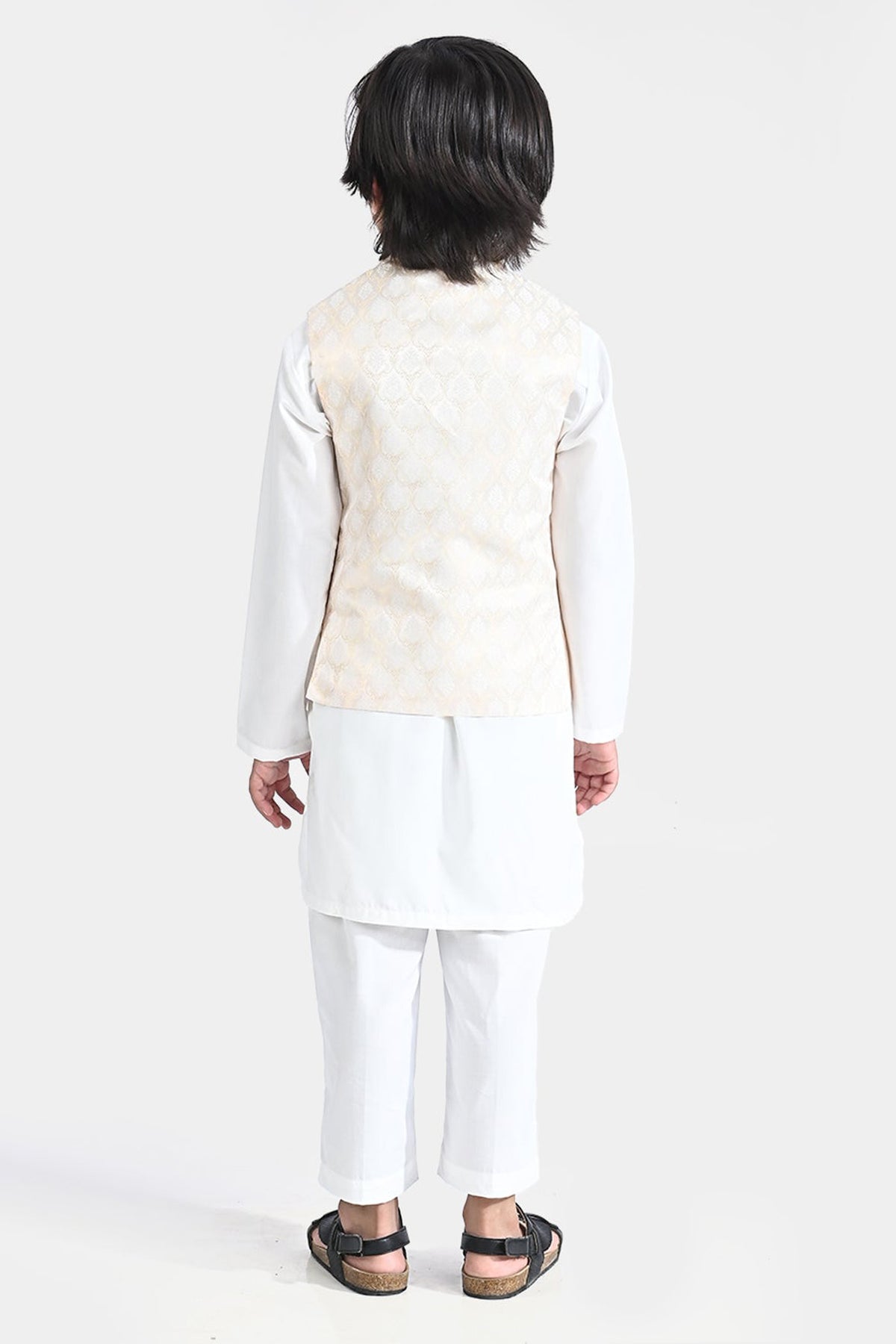 Traditional wear three-piece suit in classic white. The kurta is paired with a straight pajama and waistcoat in a rich texture to elevate the overall aesthetic appeal. Meticulously crafted, this three-piece suit ensures that your young gentleman gets a refined and elegant look.