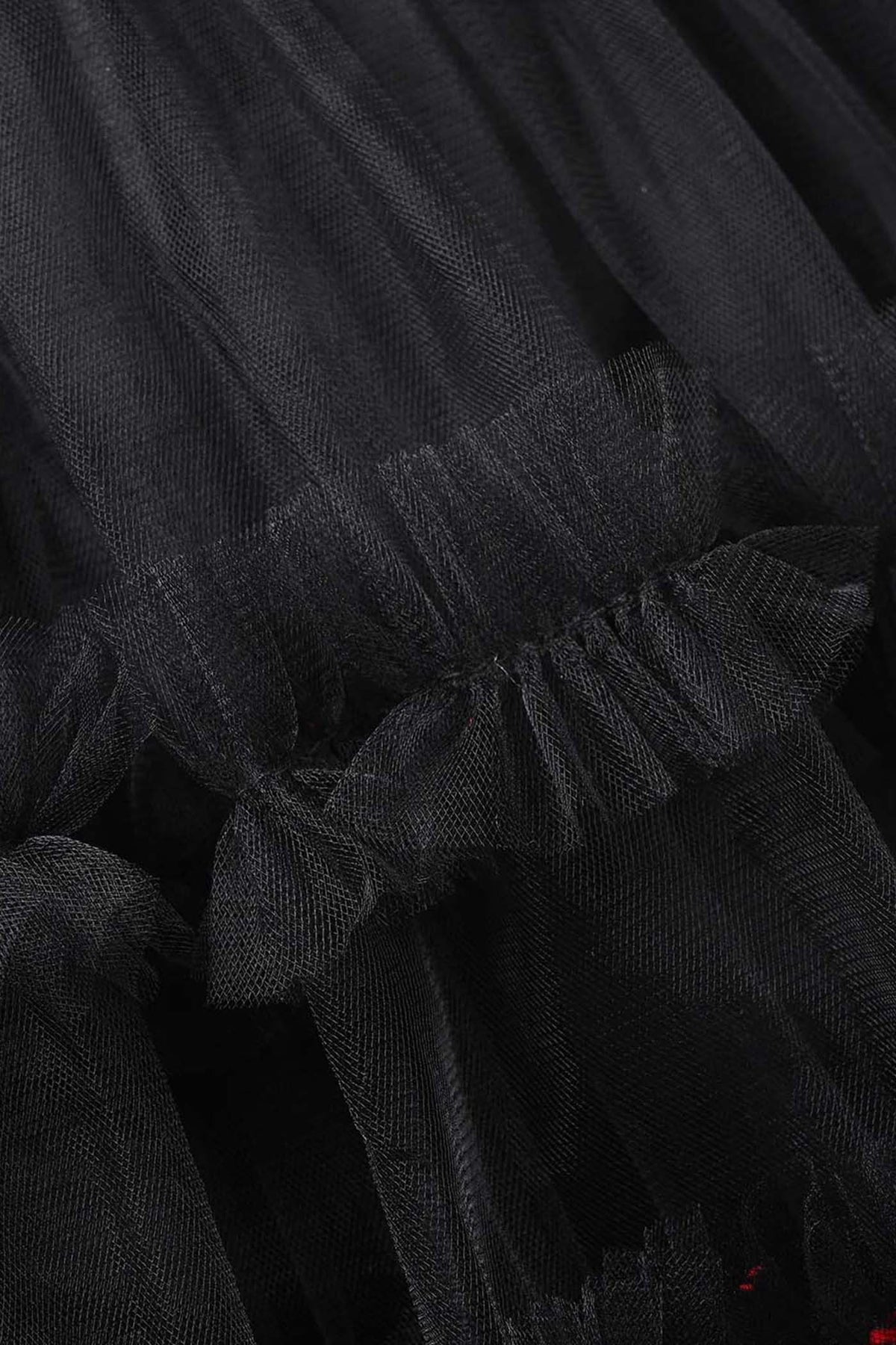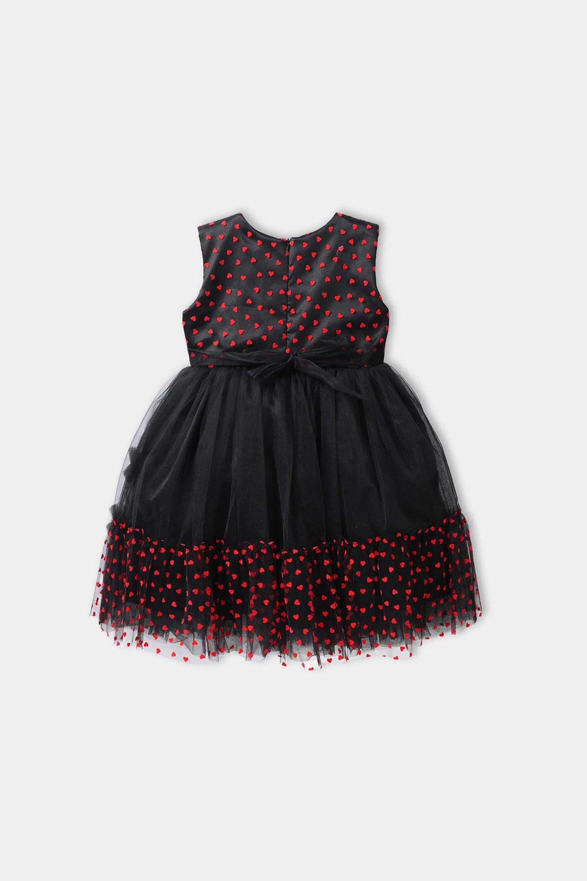 This black net infant girl's frock features red heart embroidery and a bow on the front and can be paired with panties or tights for a complete look.