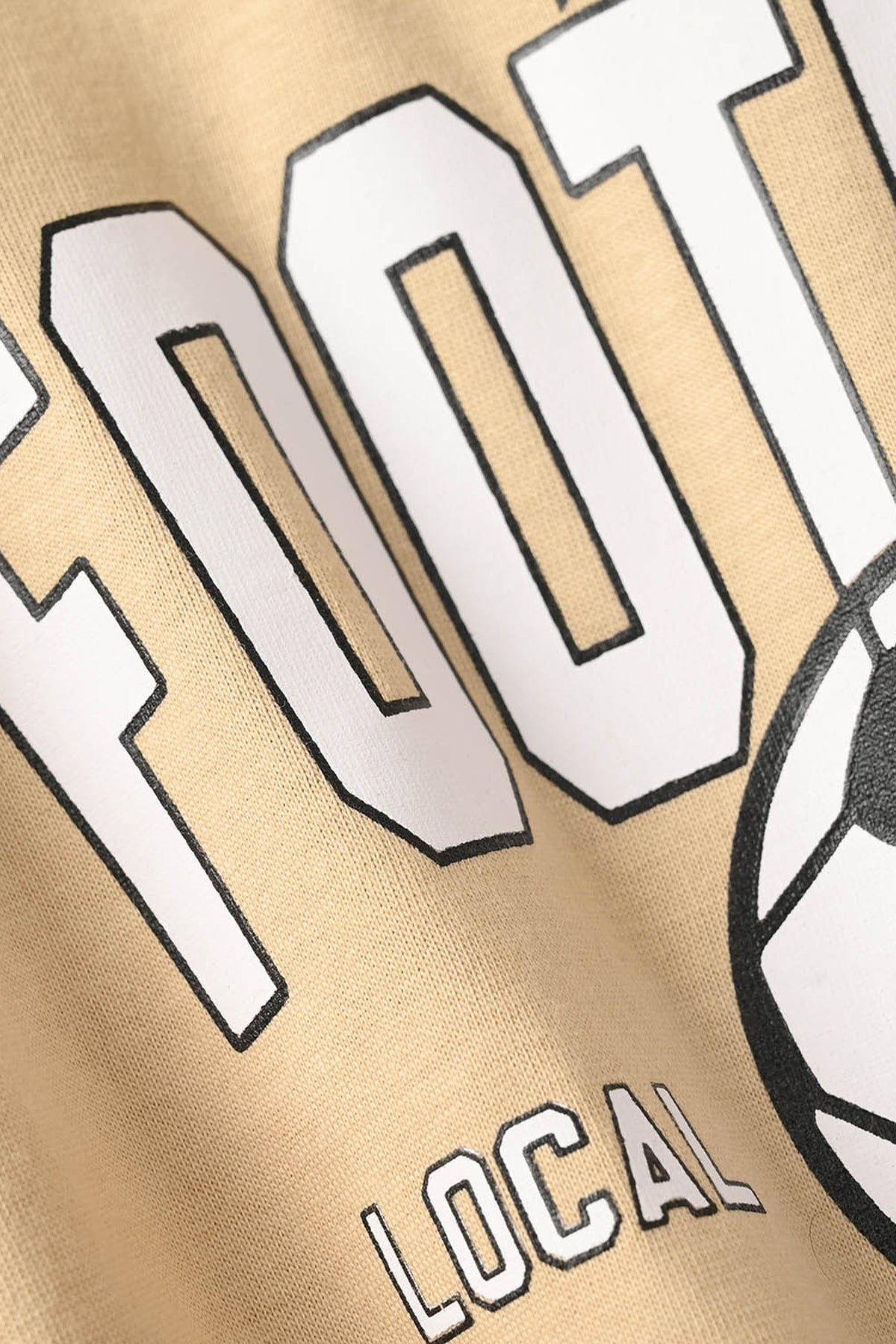 Boys warm sand-colored cotton jersey T-shirt featuring a front football print, round neck, and half sleeves for casual and comfortable everyday wear.