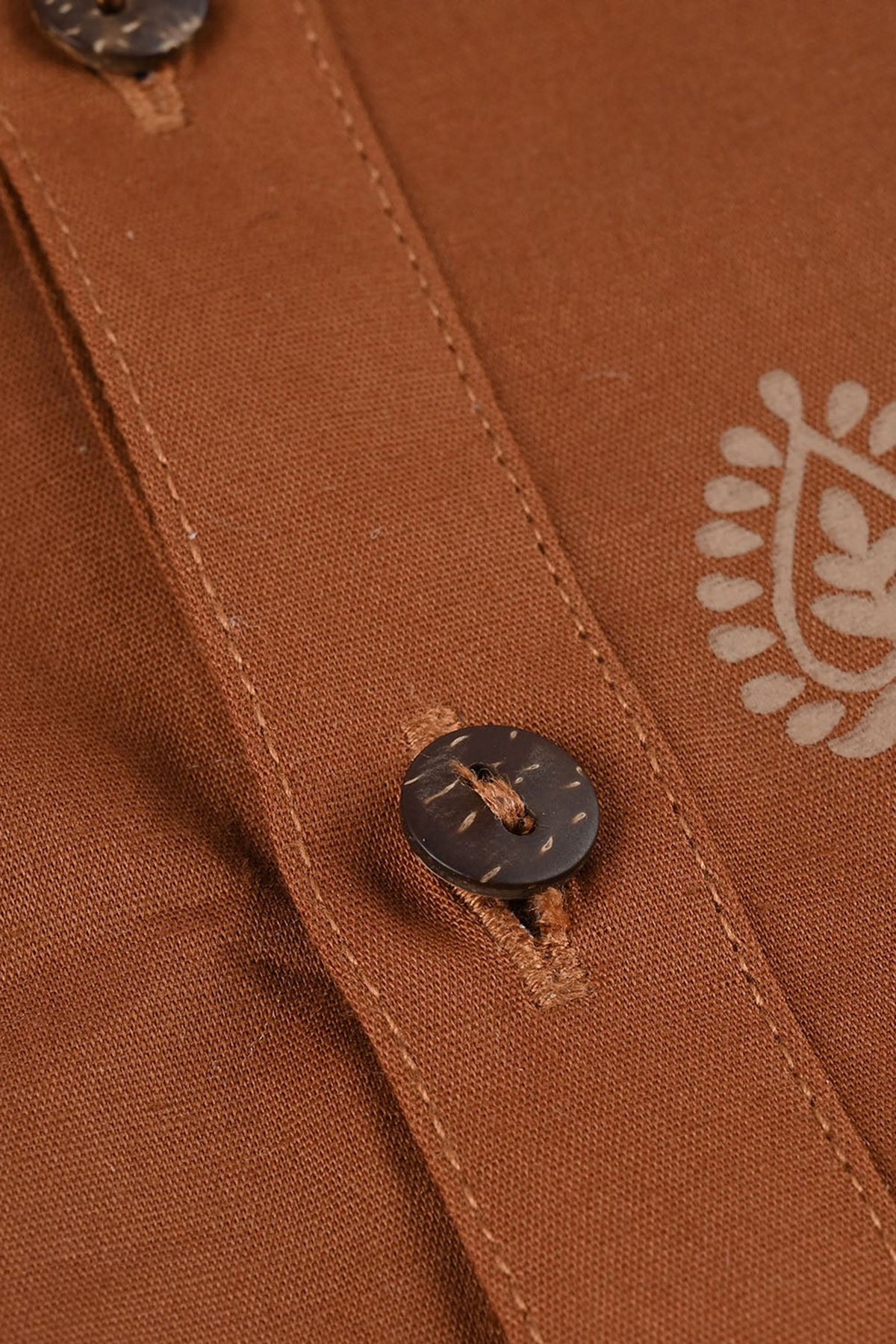 Boys brown cotton poplin printed kurta featuring a shirwani collar and full sleeves, perfect for a classic and comfortable traditional look.