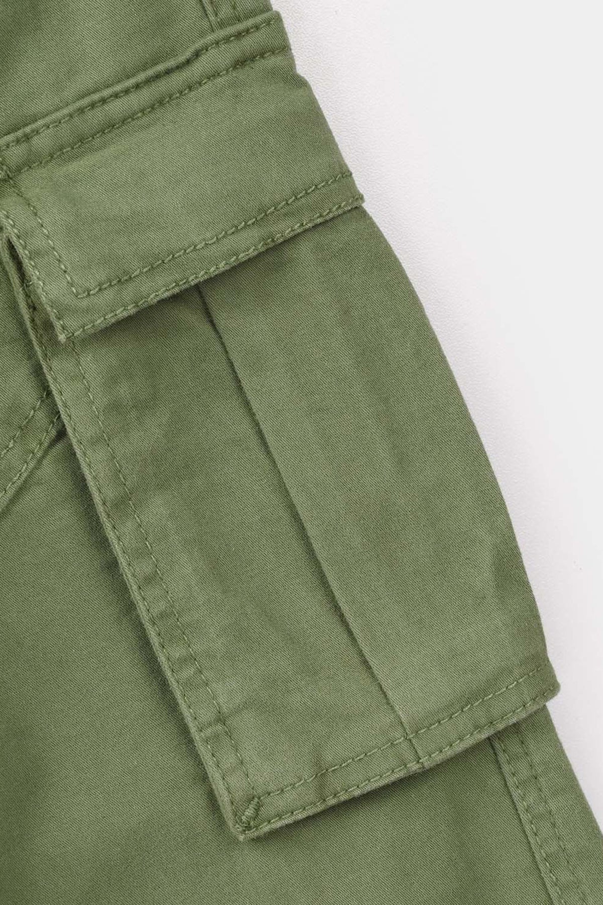Boys’ cotton twill pants in green, featuring a cargo style, elastic hem, and pockets for a comfortable, casual look.