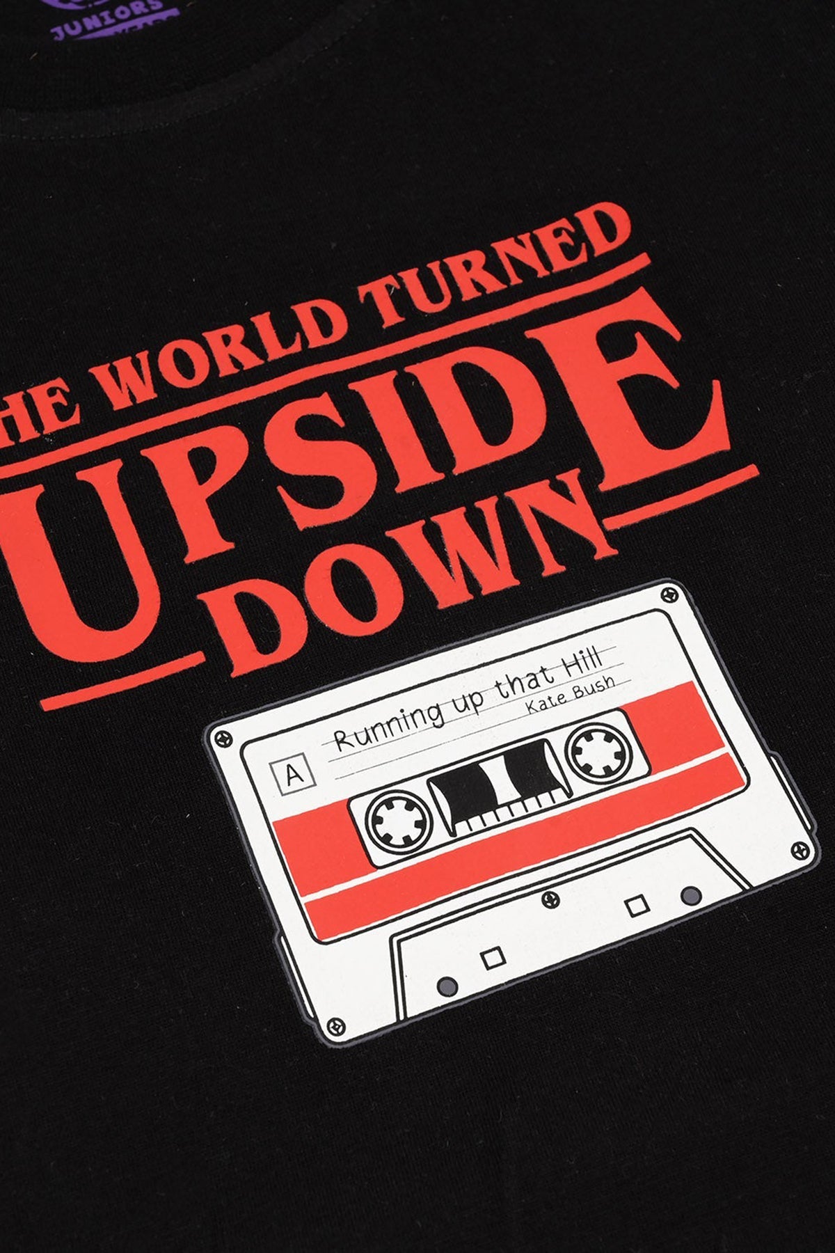 Boys’ black jersey/terry T-shirt features a round neck, full sleeves, and an upside-down printed design on the front.